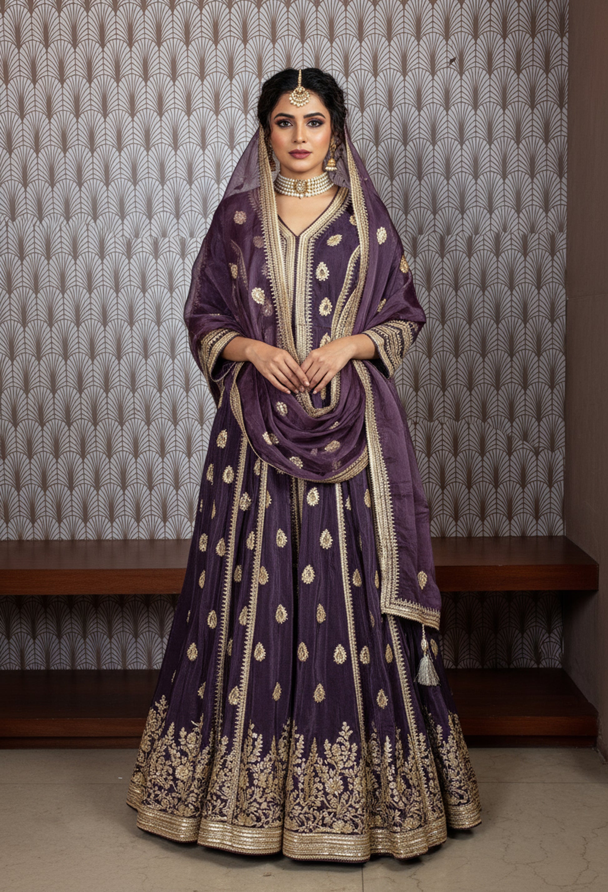 Step into regal elegance with this stunning purple velvet Anarkali gown, adorned with intricate gold zari and sequin embroidery. The rich fabric, luxurious flare, and detailed craftsmanship make it the perfect ensemble for weddings, festive occasions, and grand celebrations. The V-neckline, flared silhouette, and 3/4th embroidered sleeves add to its majestic appeal, making you look effortlessly graceful.