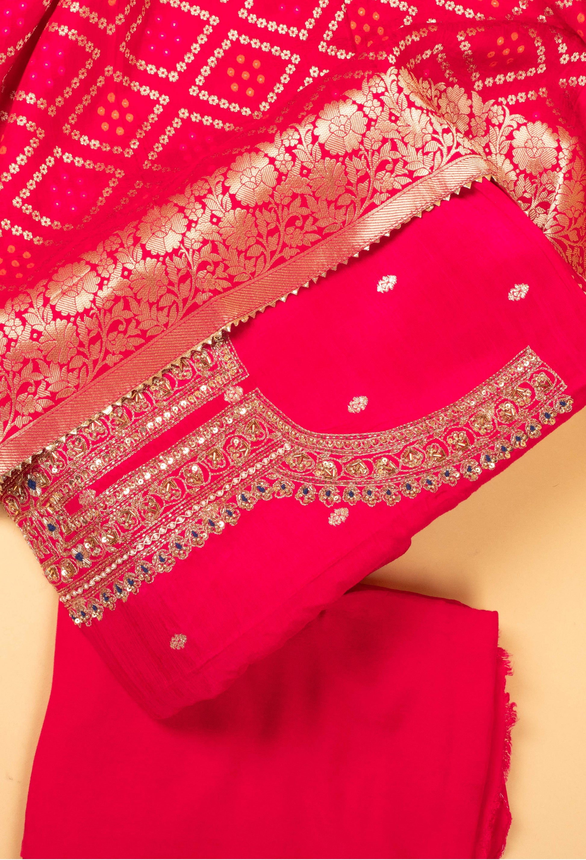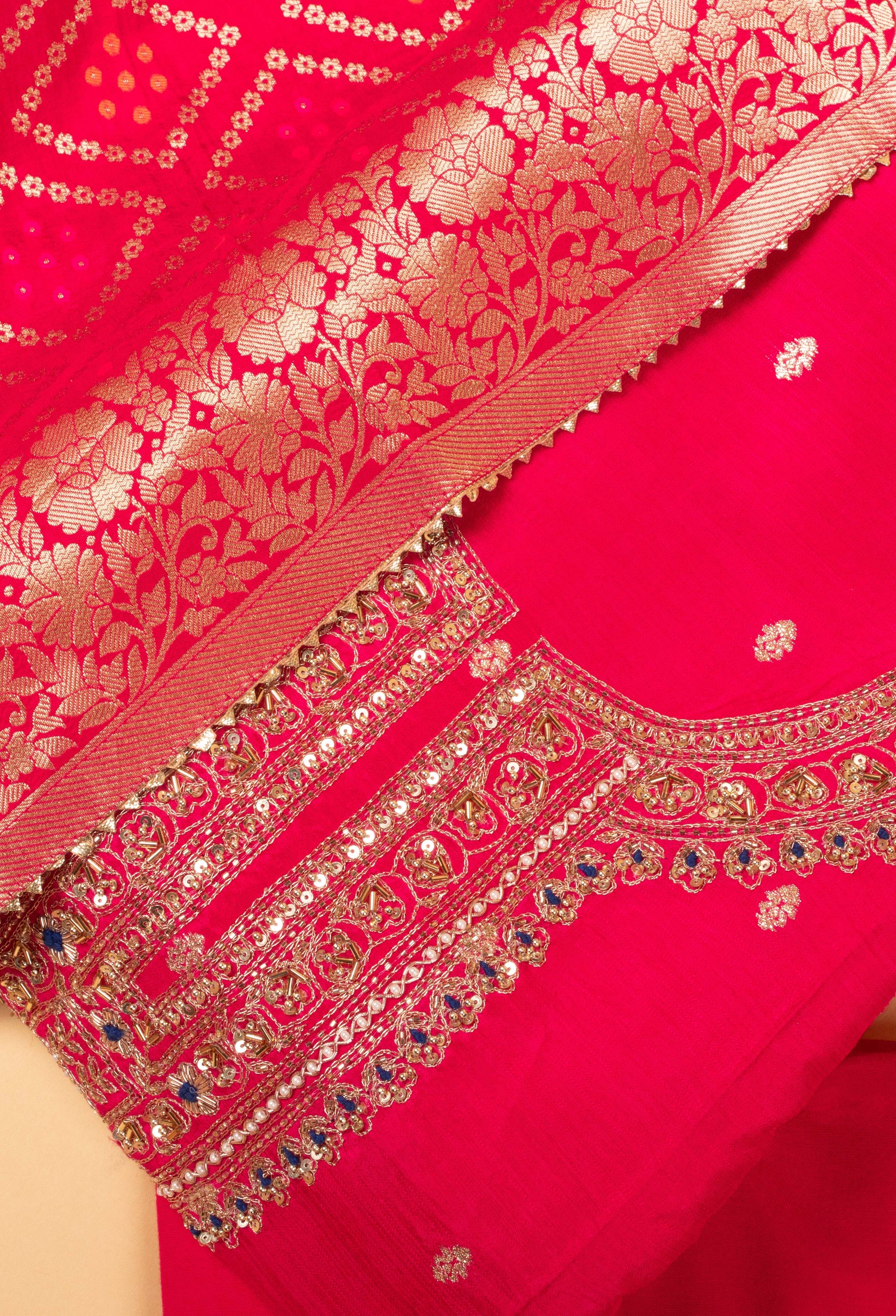 Make a bold festive statement with this stunning Rani Pink Embroidered Unstitched Dress Material, designed for rich traditional elegance. The vibrant rani pink top fabric is beautifully enhanced with intricate zari-style embroidery and delicate stone detailing along the neckline, creating a luxurious and festive appeal. The coordinated dupatta features classic woven motifs with a rich floral border, adding depth and grandeur to the ensemble. Paired with a matching solid bottom fabric, this dress material is perfect for stitching a bespoke salwar suit ideal for weddings, festivals, and celebratory occasions.