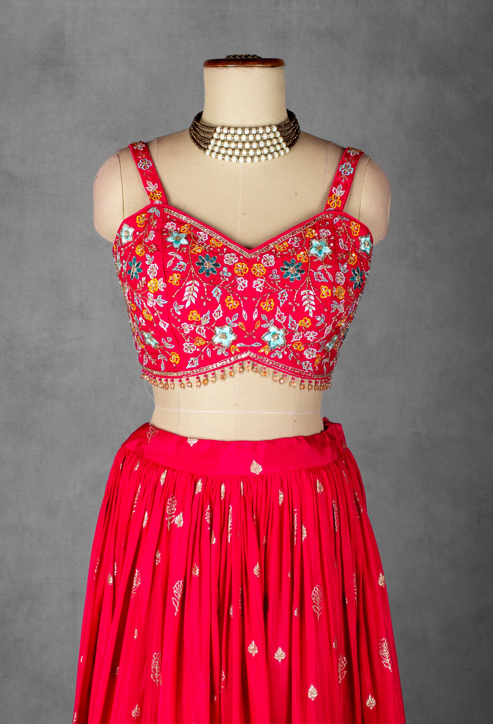 The highlight of this ensemble is the embroidered crop top, beautifully designed with multi-color floral threadwork and mirror accents. The sweetheart neckline, sleeveless design, and structured fit give it a trendy, stylish appeal perfect for daytime and festive occasions.