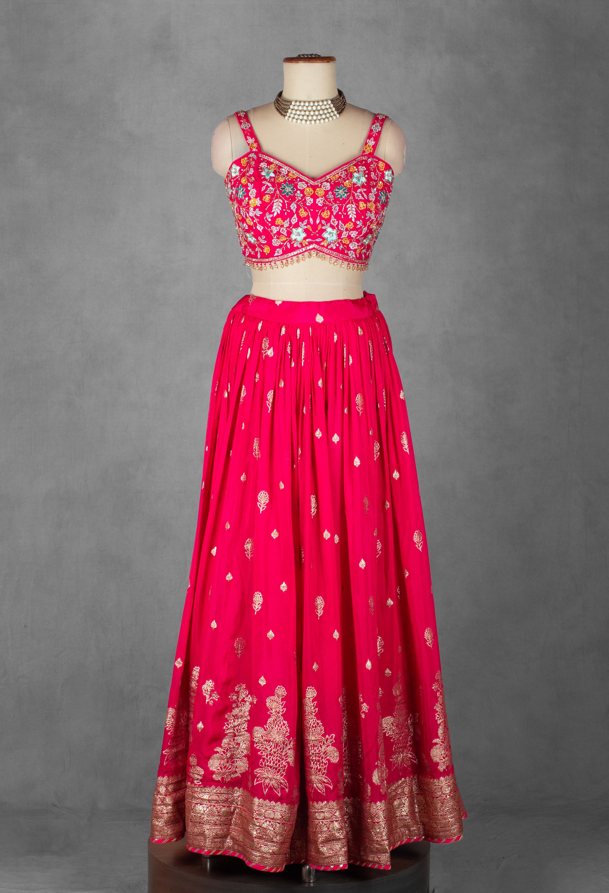 Bright, youthful, and full of festive charm—this Rani Pink Lehenga Set with Floral Designer Crop Top is crafted for the modern woman who loves vibrant traditional fashion with a contemporary twist. The lehenga features delicate golden thread embroidery along the hemline, adorned with floral motifs that add richness while keeping the look light and elegant.
