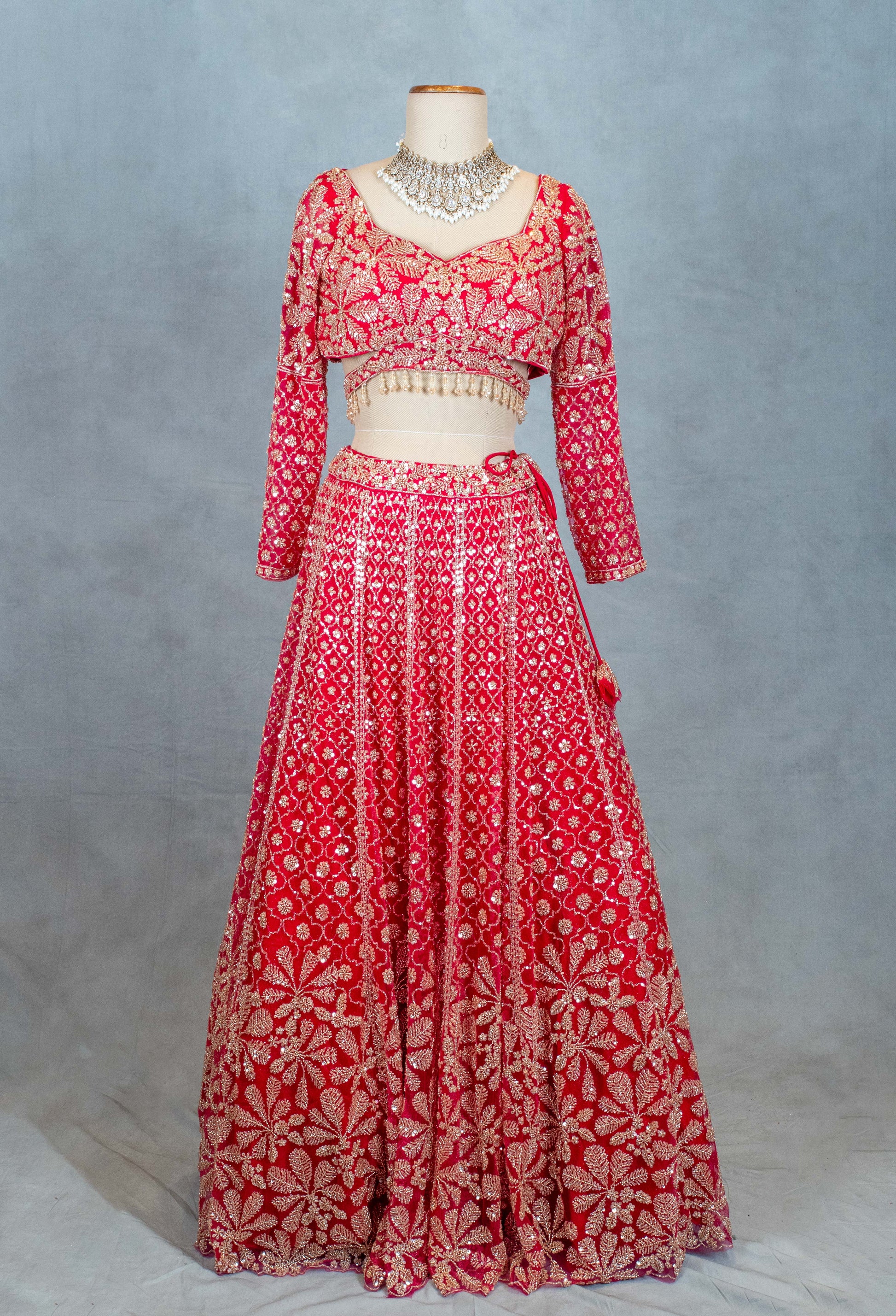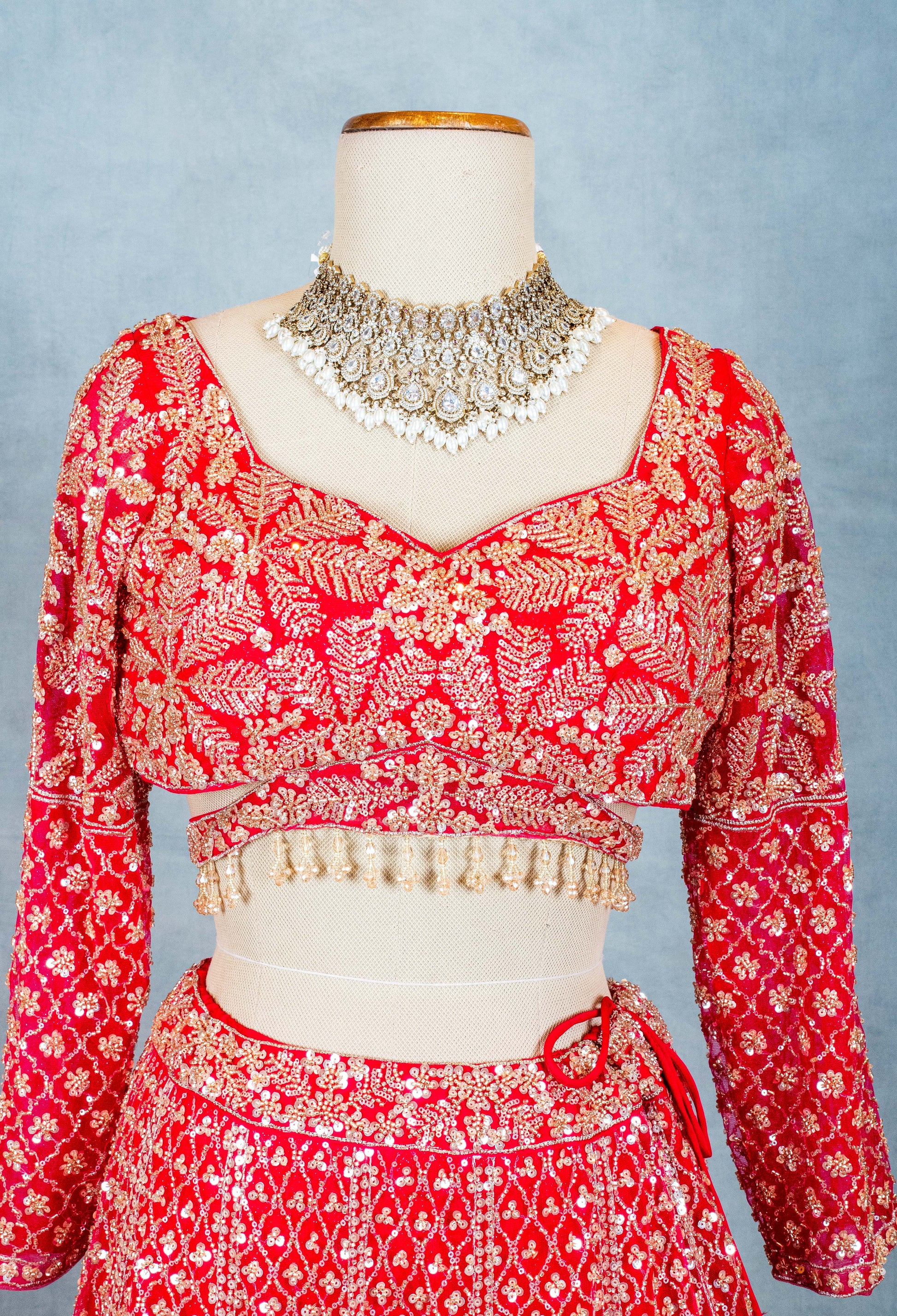Make a bold and beautiful statement in this stunning red designer crop top lehenga set, richly adorned with intricate golden embroidery. The blouse features a flattering V-neckline, three-quarter sleeves, and charming tassel detailing along the hem for a festive flair. The flared lehenga skirt showcases exquisite handwork with floral and geometric motifs that gracefully flow from waist to hem. The ensemble is completed with a coordinated net dupatta, elegantly embroidered and finished with a scalloped border. Ideal for bridesmaids, festive occasions, and traditional ceremonies, this set combines elegance with cultural charm.