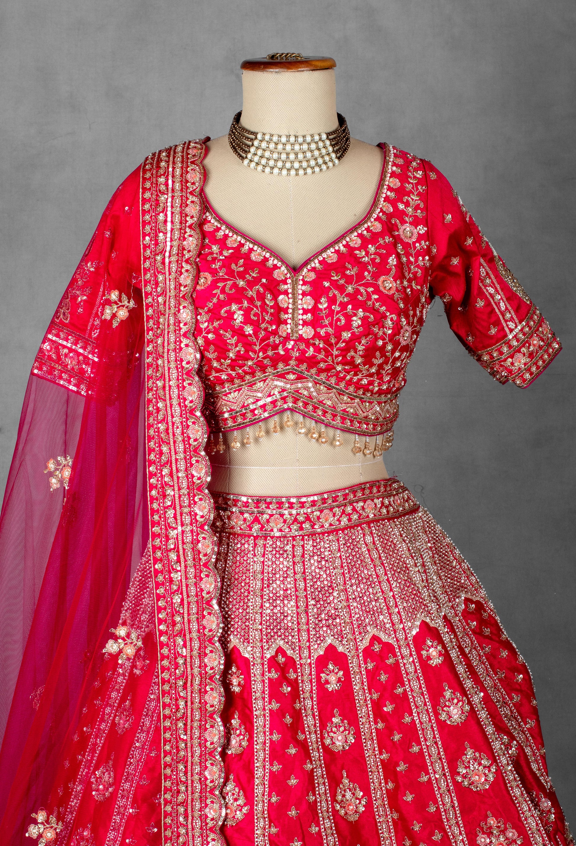 Radiate timeless elegance in this red embroidered bridal crop top lehenga set, a stunning ensemble that celebrates Indian craftsmanship with a modern twist. The richly detailed crop top blouse features intricate zari, sequin, and bead embroidery, complemented by a graceful scalloped hemline that adds a hint of contemporary flair.