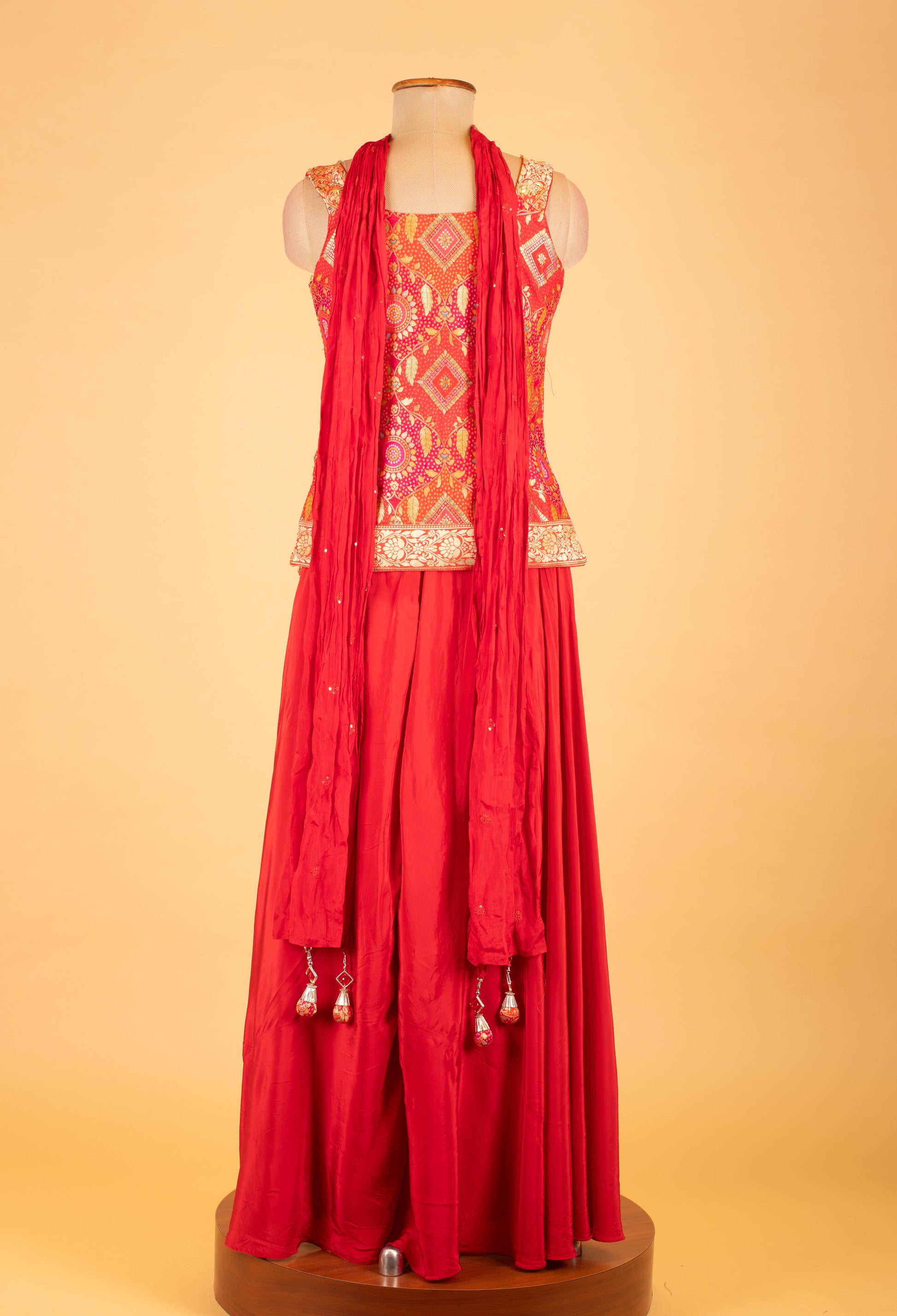 Celebrate in bold elegance with this stunning red palazzo set, designed to reflect contemporary charm with traditional artistry. The sleeveless embroidered jacket is the highlight — adorned with detailed threadwork, mirror accents, and rich ethnic motifs in gold and multi-hues.