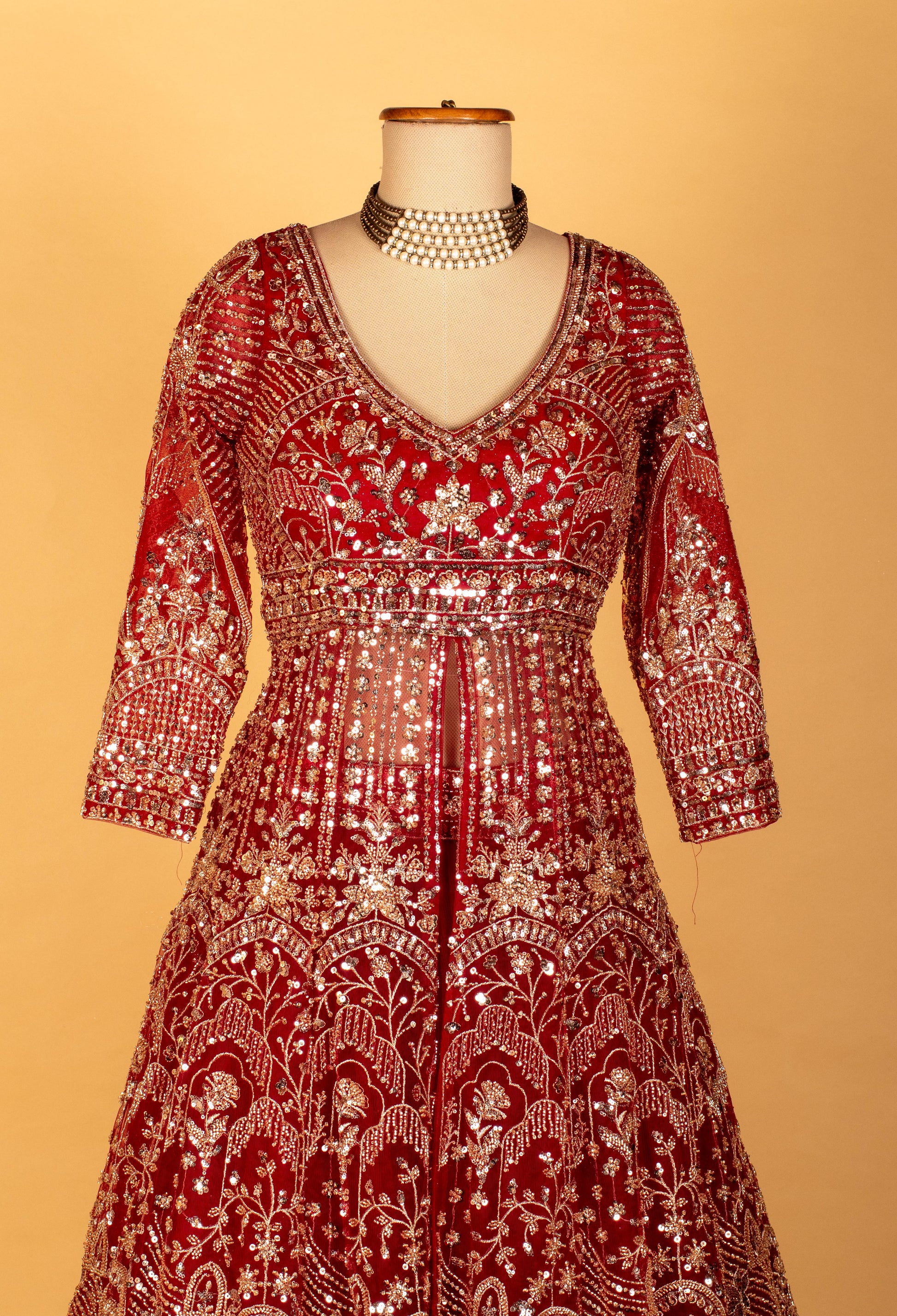 Make a breathtaking entrance in this luxurious red bridal gown, crafted with intricate silver sequin, zari, and thread embroidery that covers the entire silhouette. Designed for the modern bride who wants regal elegance with effortless charm, this gown features a rich red base adorned with heavy handwork inspired by traditional architectural and floral motifs.