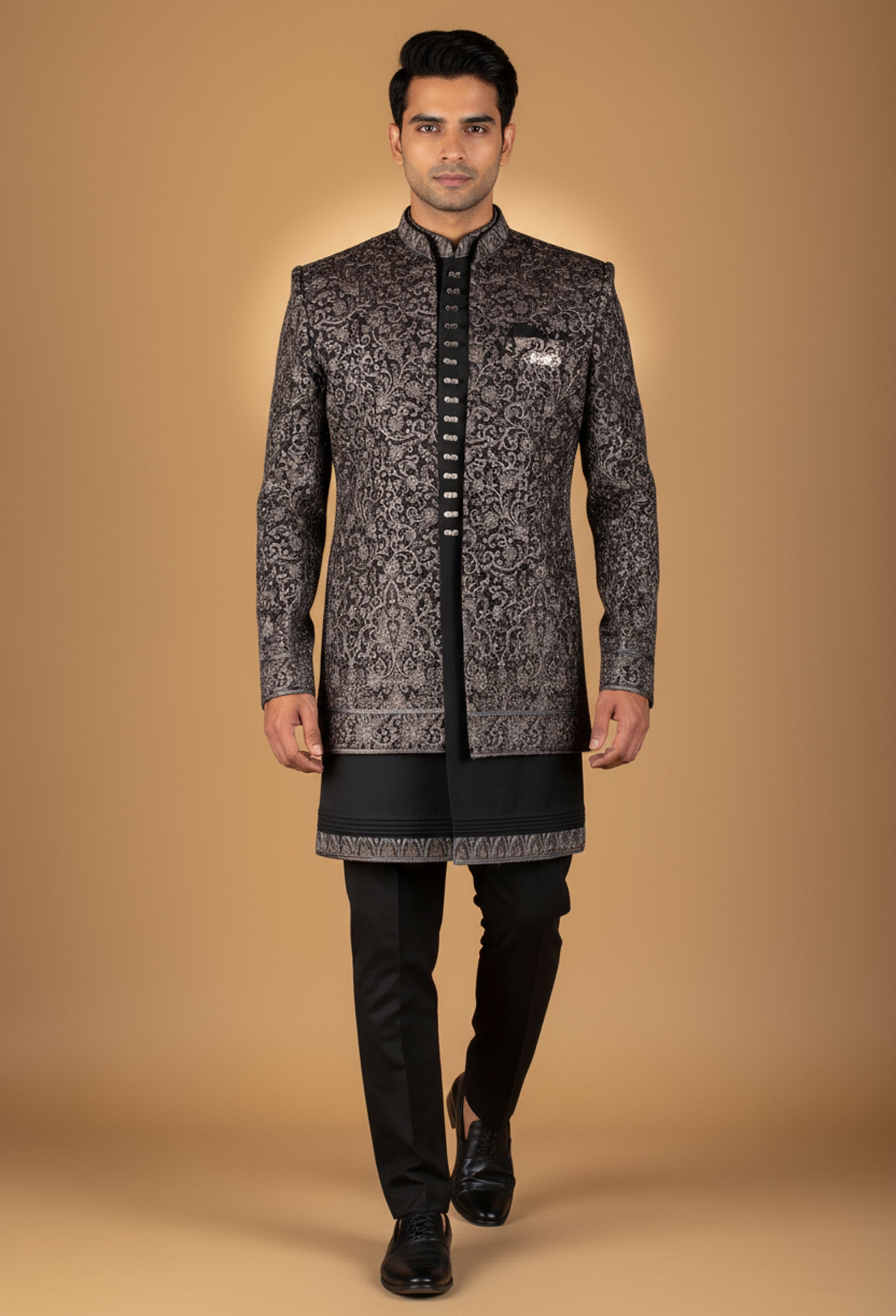 Channel regal sophistication with this Black Indo-Western Sherwani, designed to strike the perfect balance between traditional elegance and modern flair. Crafted from premium fabric, the outfit features an all-over silver metallic thread embroidery in a classic paisley and floral motif that adds a rich, textural dimension to the garment.