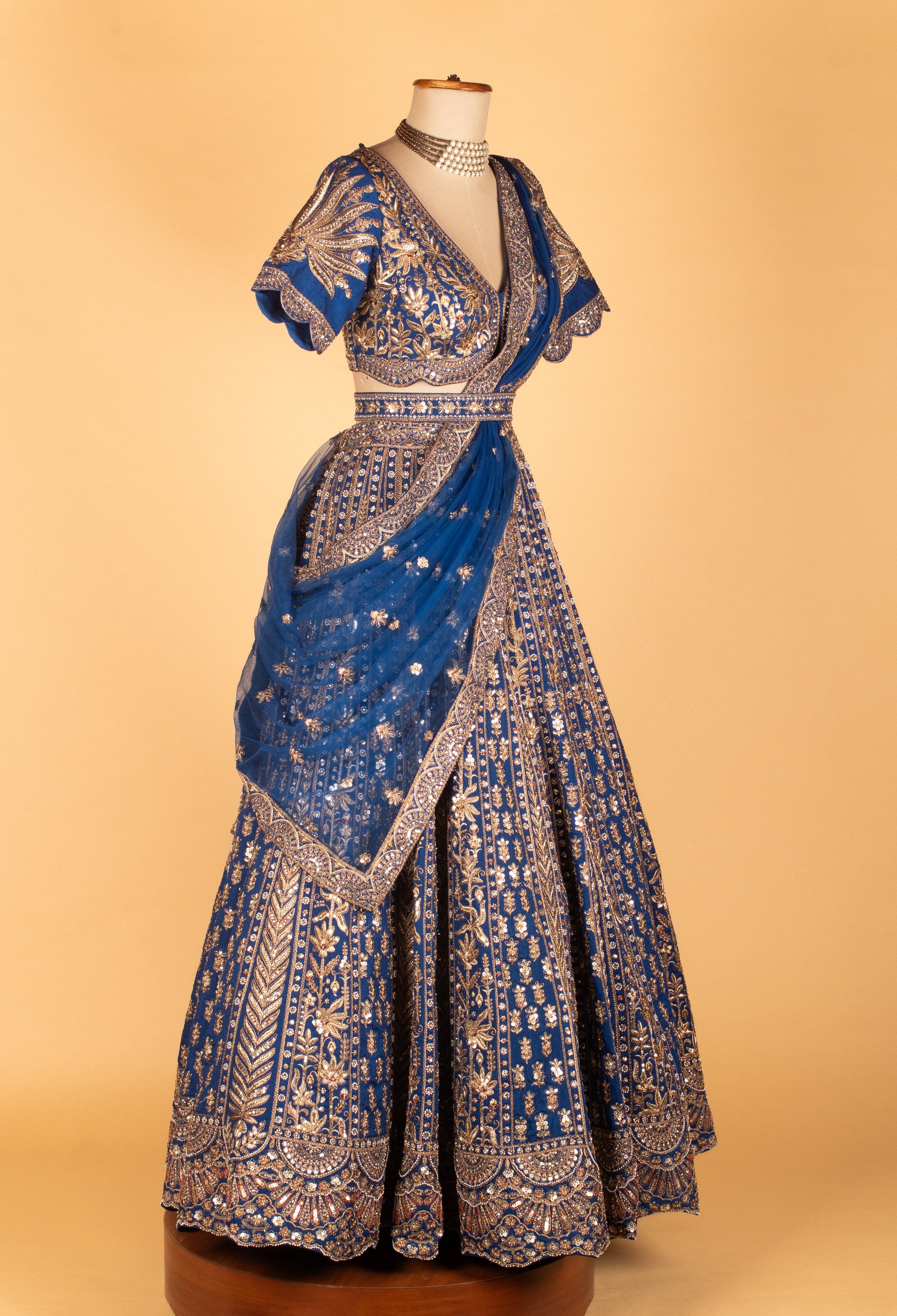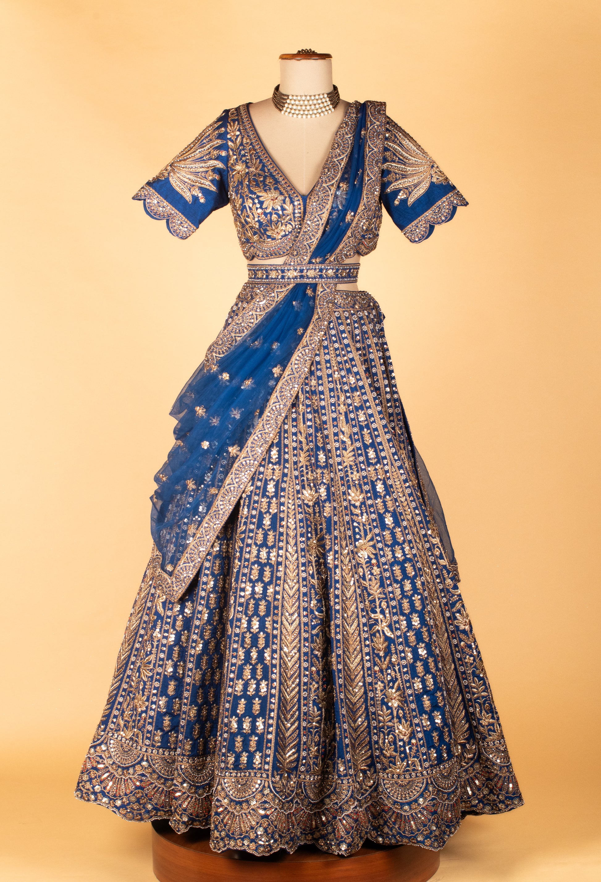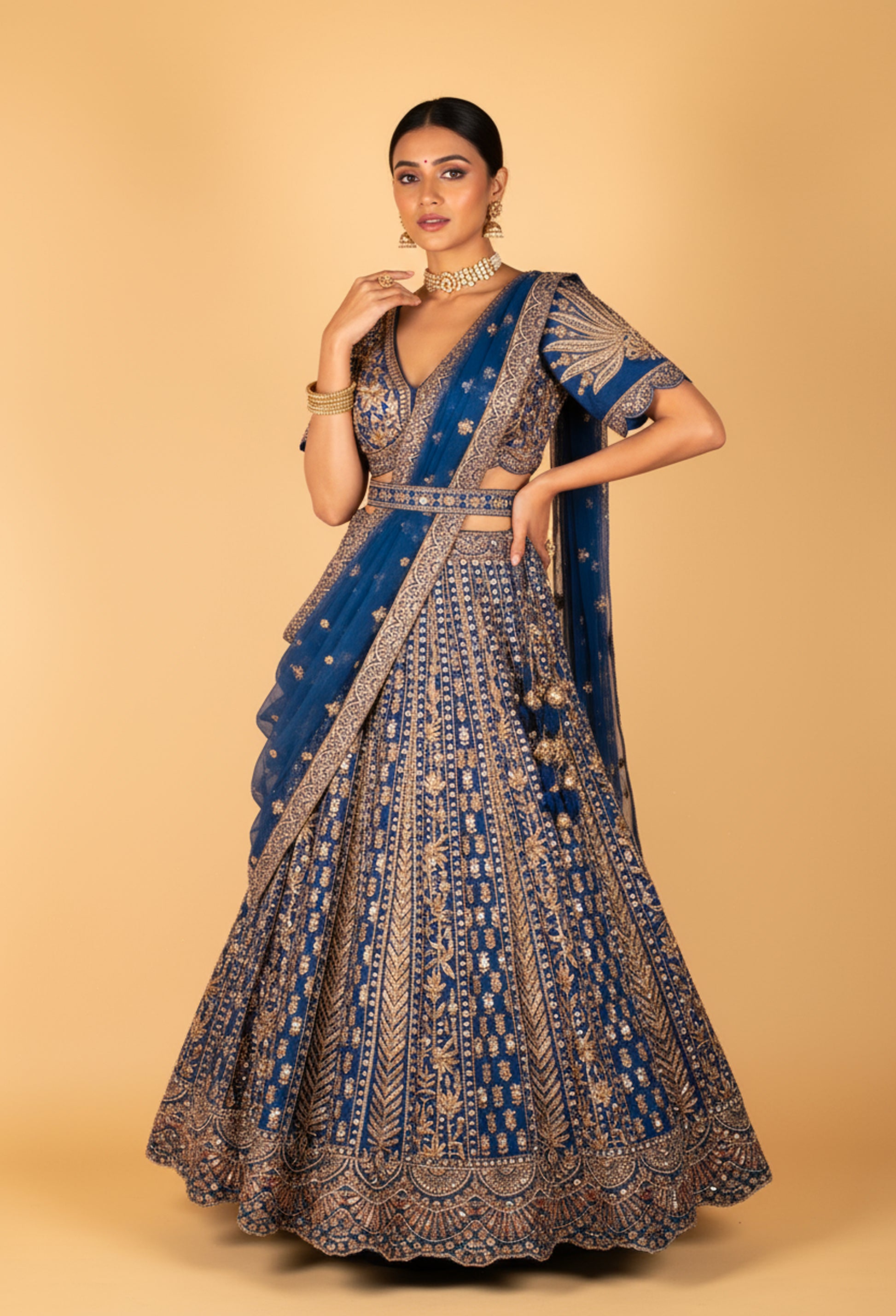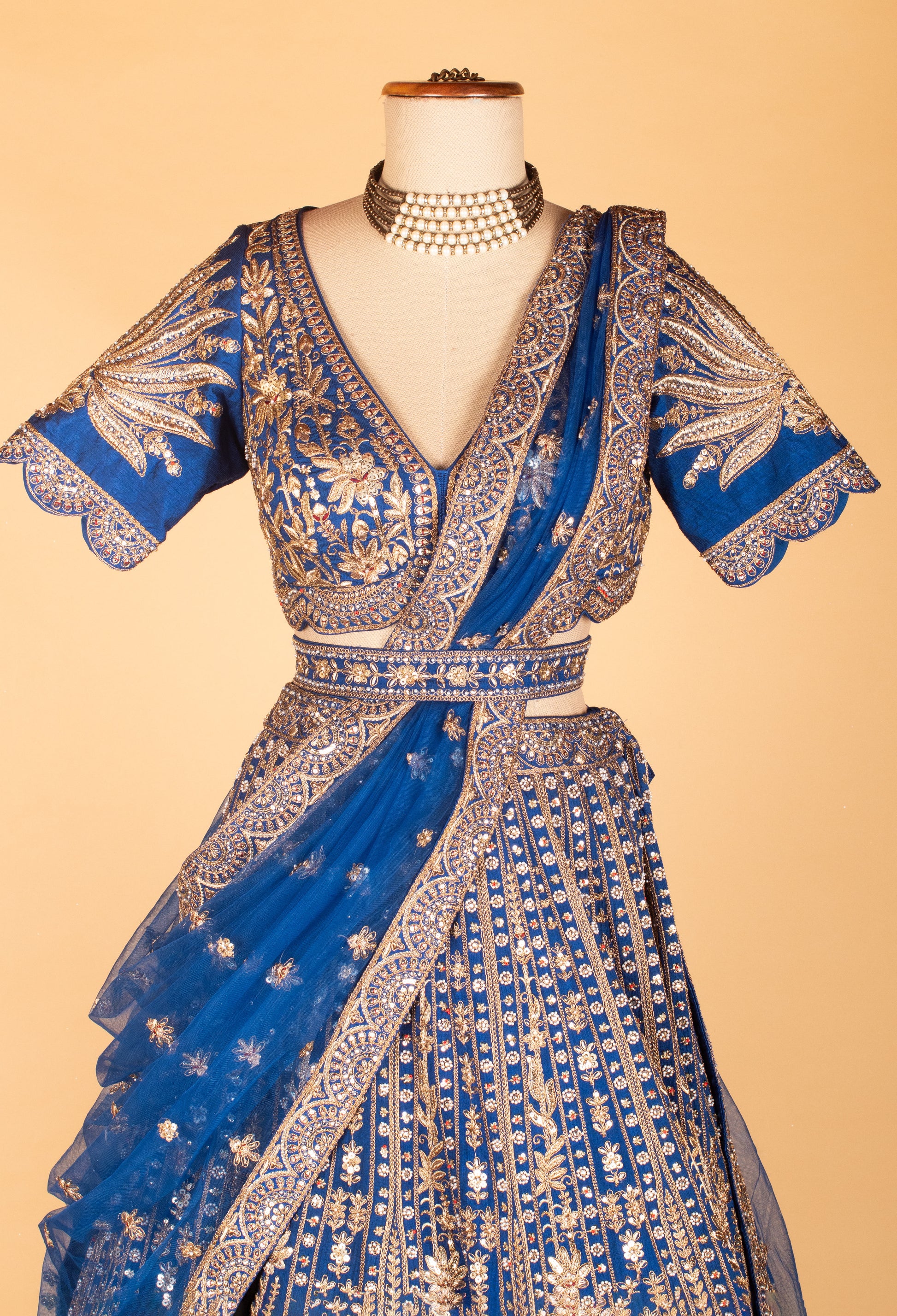 A masterpiece of regal craftsmanship — this royal blue lehenga set features luxurious zari and resham embroidery inspired by heritage textile motifs. The crop top blouse is designed with a sculpted V-neck and elegant scalloped short sleeves, highlighted with bold leaf-pattern embroidery. The structured lehenga skirt carries vertical placement embroidery that elongates the body and enhances the silhouette.