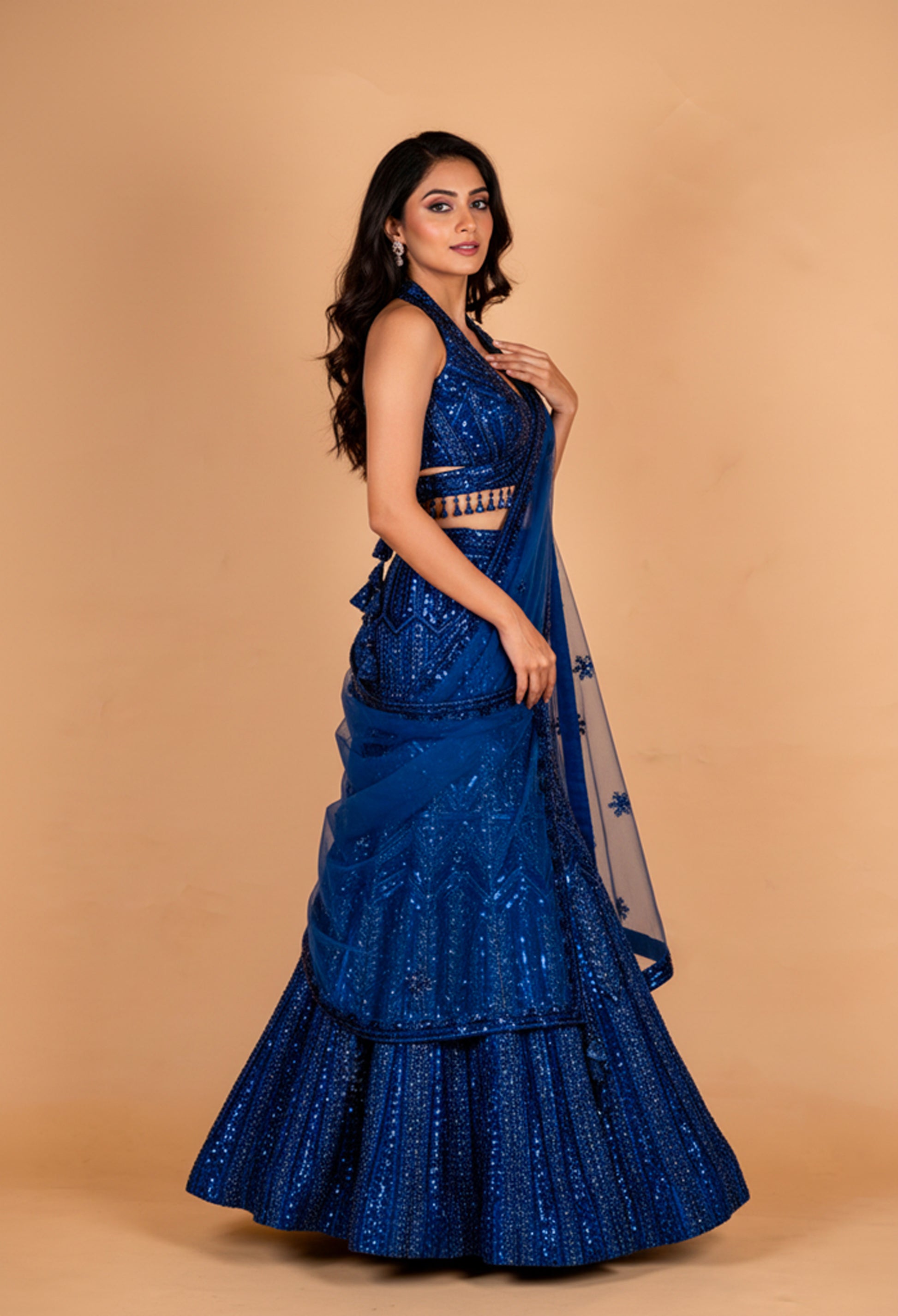 Step into spotlight glamour with this stunning royal blue sequin mermaid lehenga set, crafted for bold and sophisticated celebrations. The rich blue hue combined with intricate sequin detailing creates a luxurious shimmer that enhances every movement.