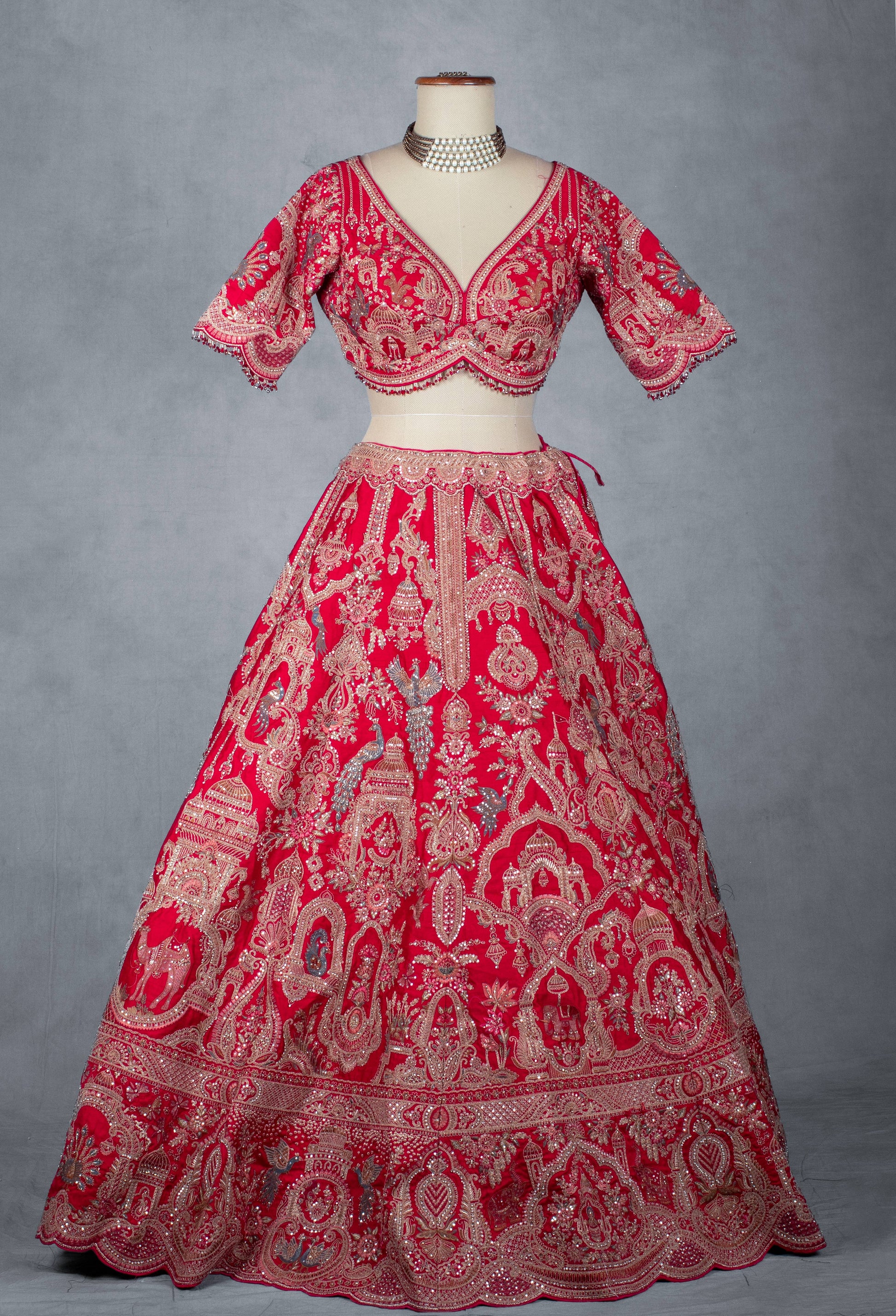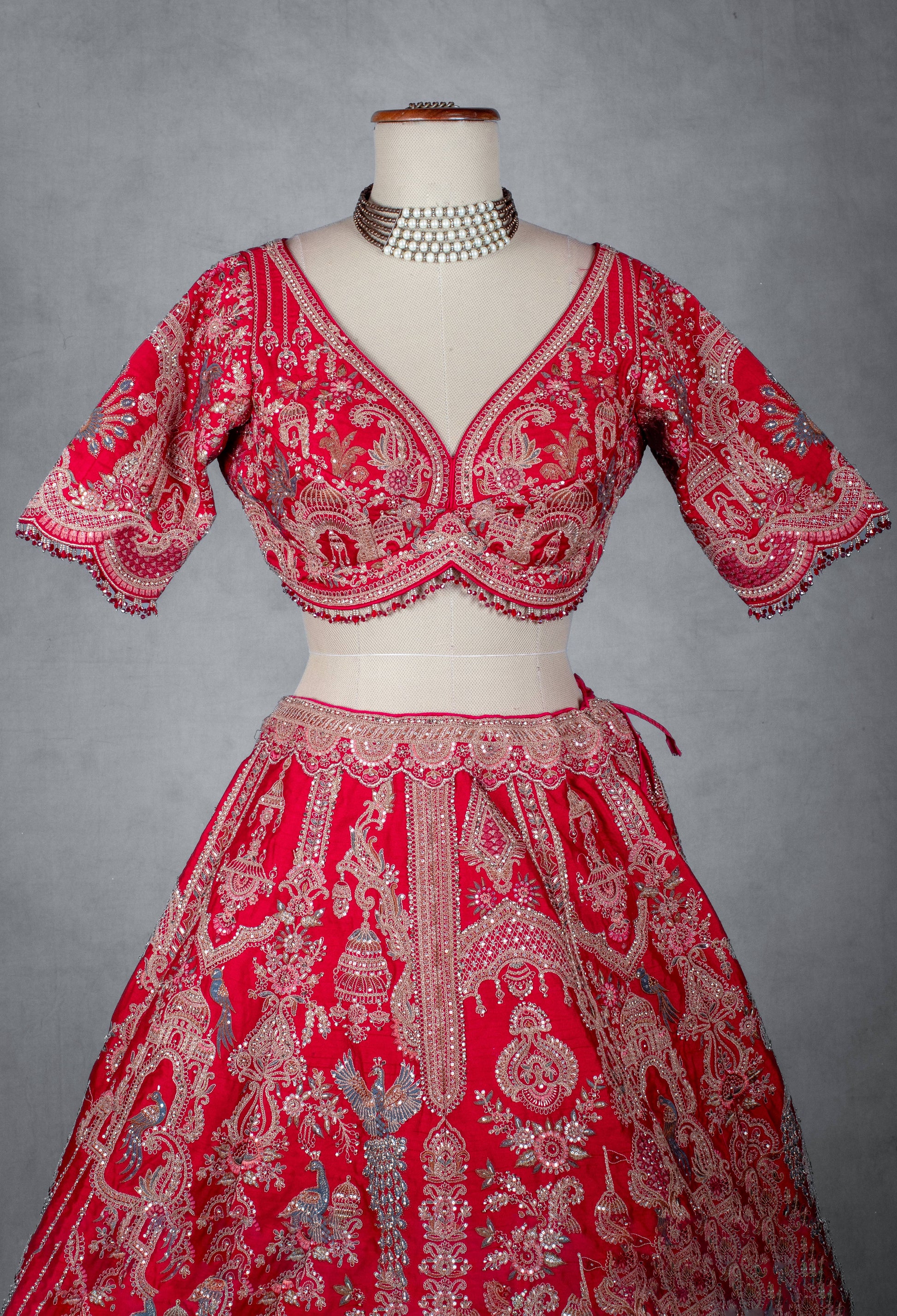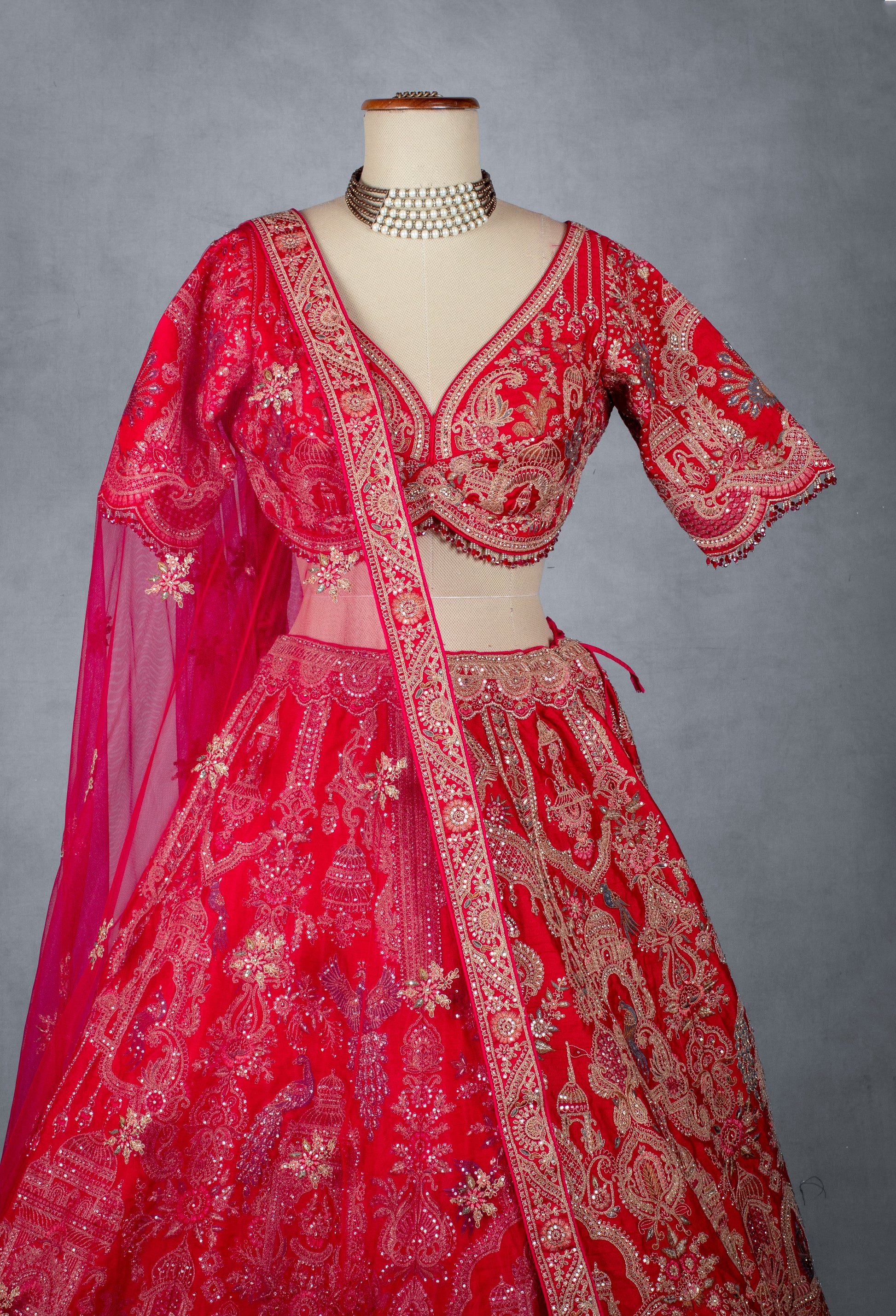 Celebrate the essence of royal grandeur with this ruby red hand-embroidered bridal lehenga set, an epitome of timeless beauty and fine craftsmanship. The deep sweetheart neckline blouse is adorned with elaborate zari, sequin, and thread embroidery, capturing intricate floral and architectural motifs that shimmer in regal brilliance.