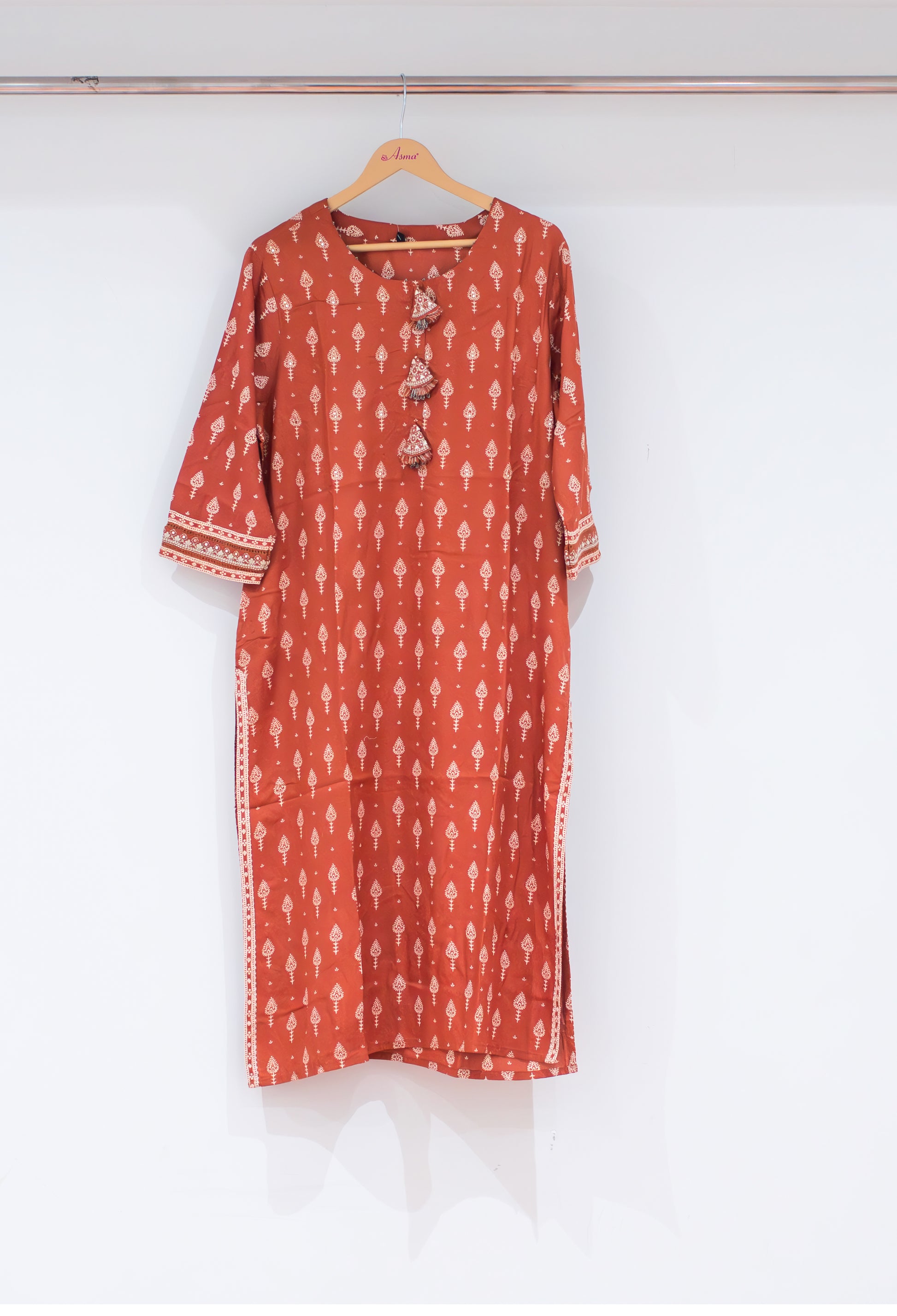 Elevate your ethnic wardrobe with this elegant rust printed straight kurta, designed for both comfort and style. Featuring a classic all-over traditional motif print and a decorative tassel neckline, this kurta brings a perfect blend of heritage charm and modern simplicity.