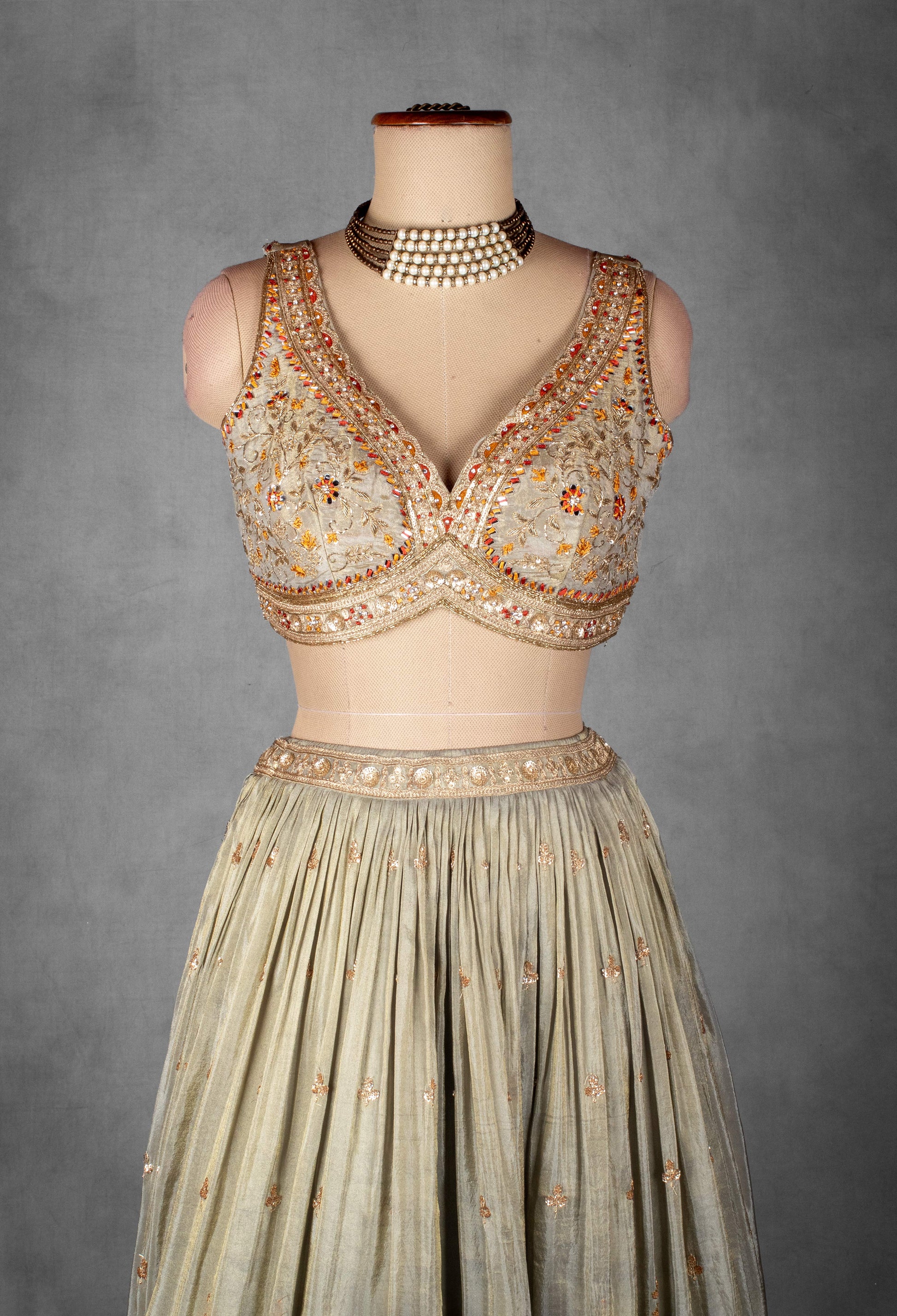 The highlight of this ensemble is the heavily embroidered designer crop top, embellished with sequins, pearls, beads, and fine threadwork, creating a glamorous yet sophisticated statement piece. The structured V-neckline and sleeveless cut add modern appeal while complementing the serene elegance of the lehenga.