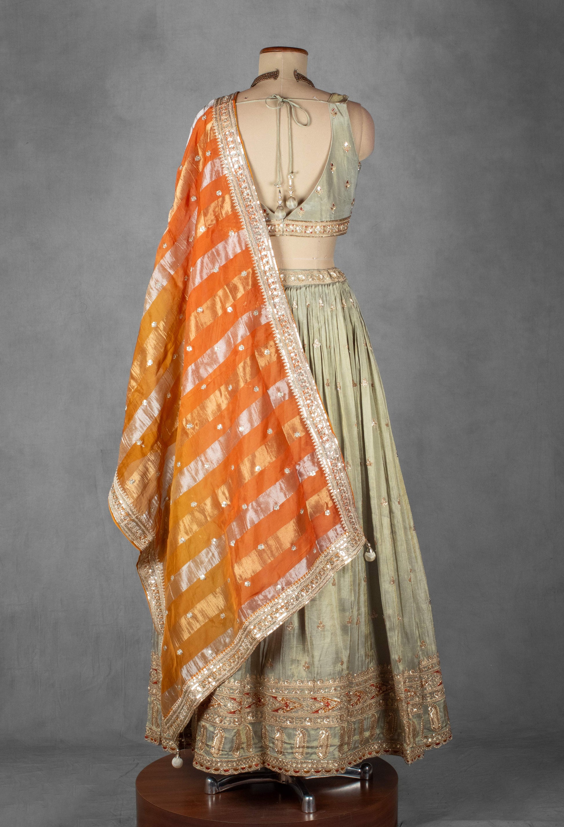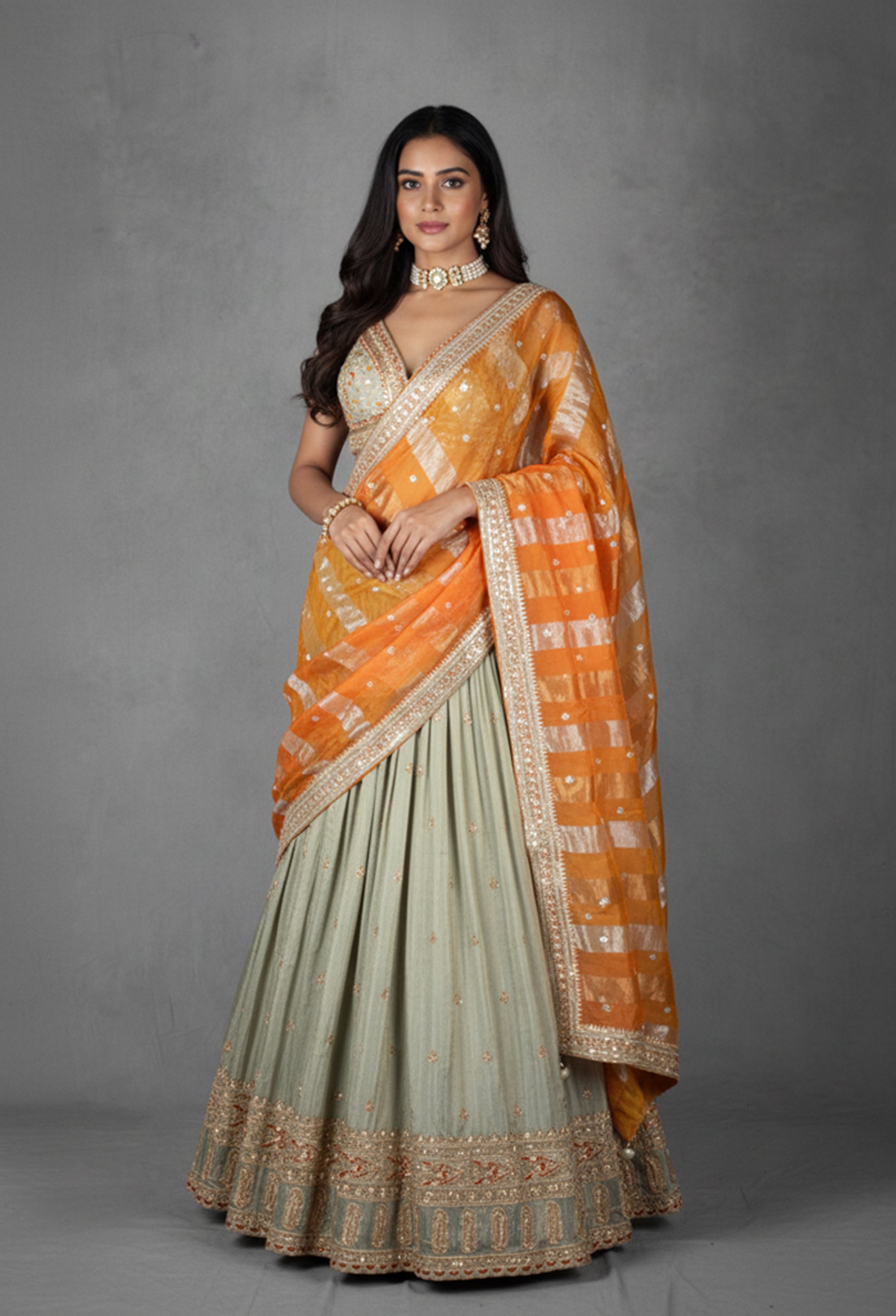 Fresh, elegant, and beautifully balanced—this Sage Green Embroidered Lehenga Set brings together soft pastels with eye-catching contrast detailing. The lehenga features delicate thread and sequin embroidery in floral motifs, paired with a soft, flowy silhouette that enhances movement and comfort. Its subtle sheen and intricate hemline work add richness while maintaining a refined, pastel aesthetic.