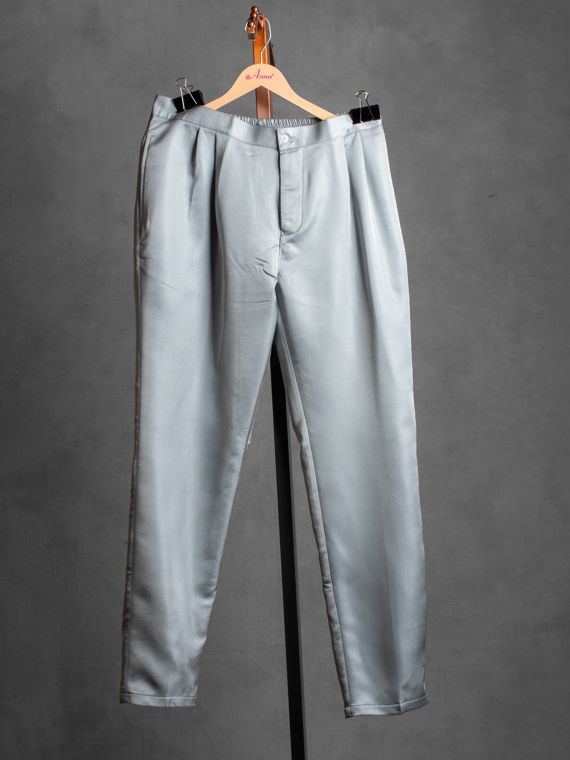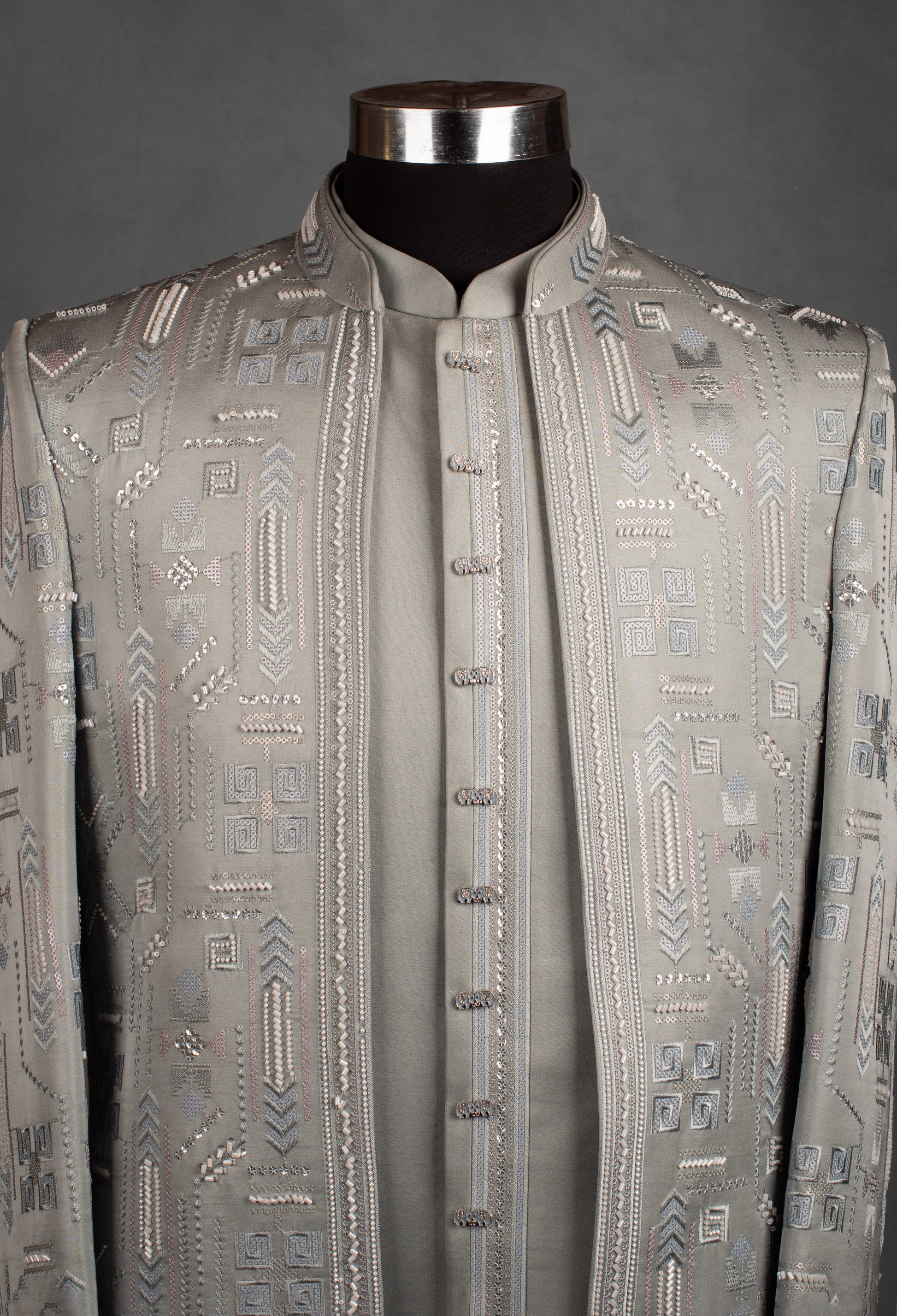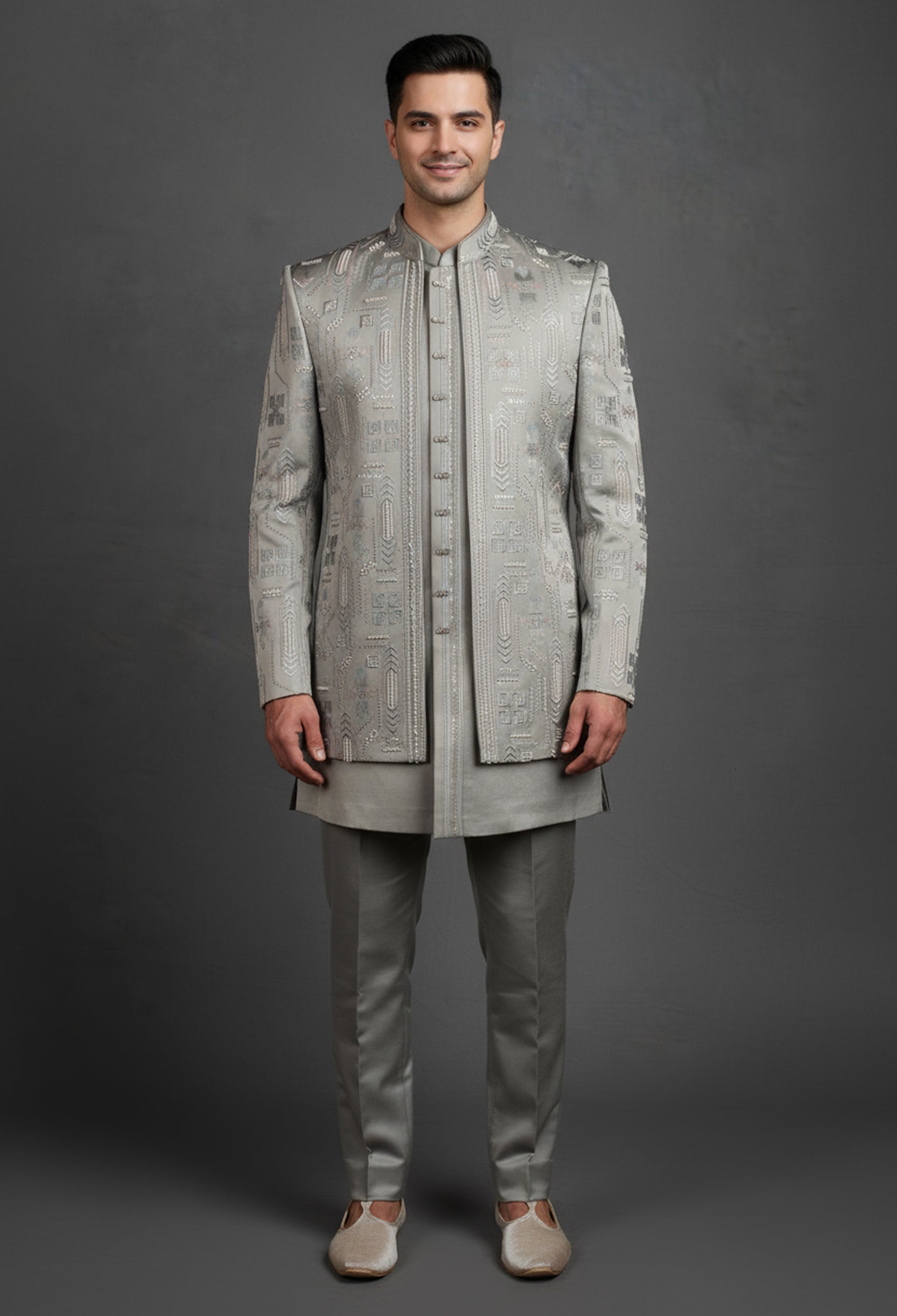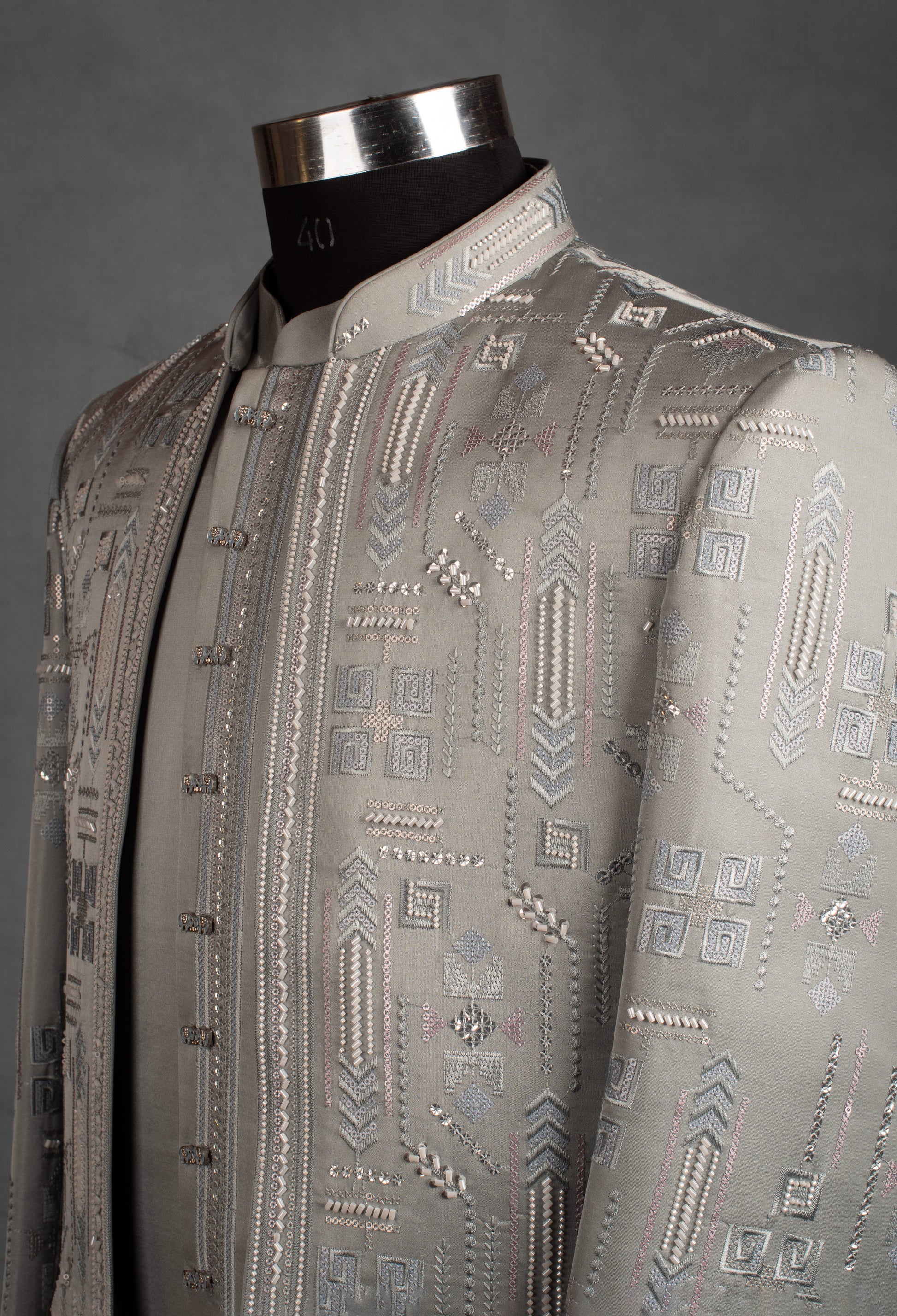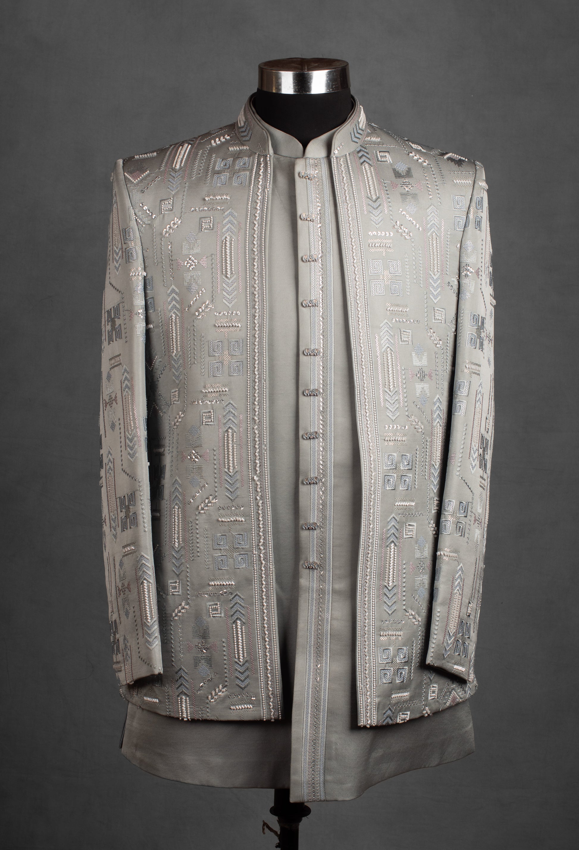 Step into modern royalty with this Silver Grey Embroidered Indo-Western Jacket, a sophisticated fusion of traditional craftsmanship and contemporary design. Crafted from premium silk-blend fabric, this ensemble features intricate geometric embroidery and beadwork in soft metallic tones of silver and pastel hues, lending it an understated yet opulent charm.