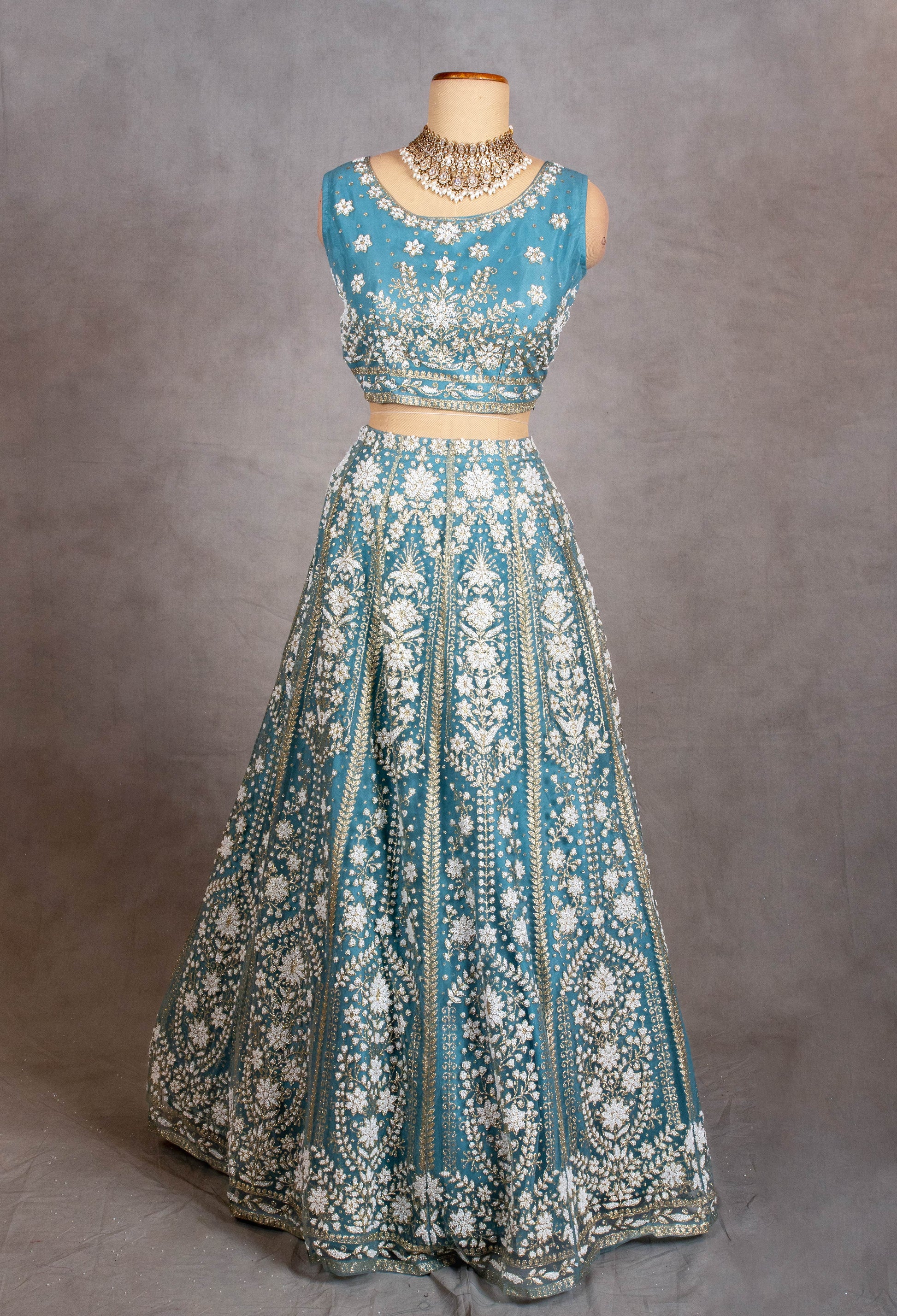 Turn heads in this elegant sky blue crop top lehenga set, featuring stunning all-over floral embroidery in shades of ivory and gold. The sleeveless blouse offers a modern twist with a clean, round neckline, while the flared lehenga skirt showcases vertical embroidered panels, giving a graceful and lengthening effect. A sheer net dupatta adorned with scalloped lace borders and delicate floral motifs adds a romantic finish to this ensemble. Perfect for bridesmaids, daytime weddings, and festive functions, this set blends subtle glamour with traditional aesthetics.