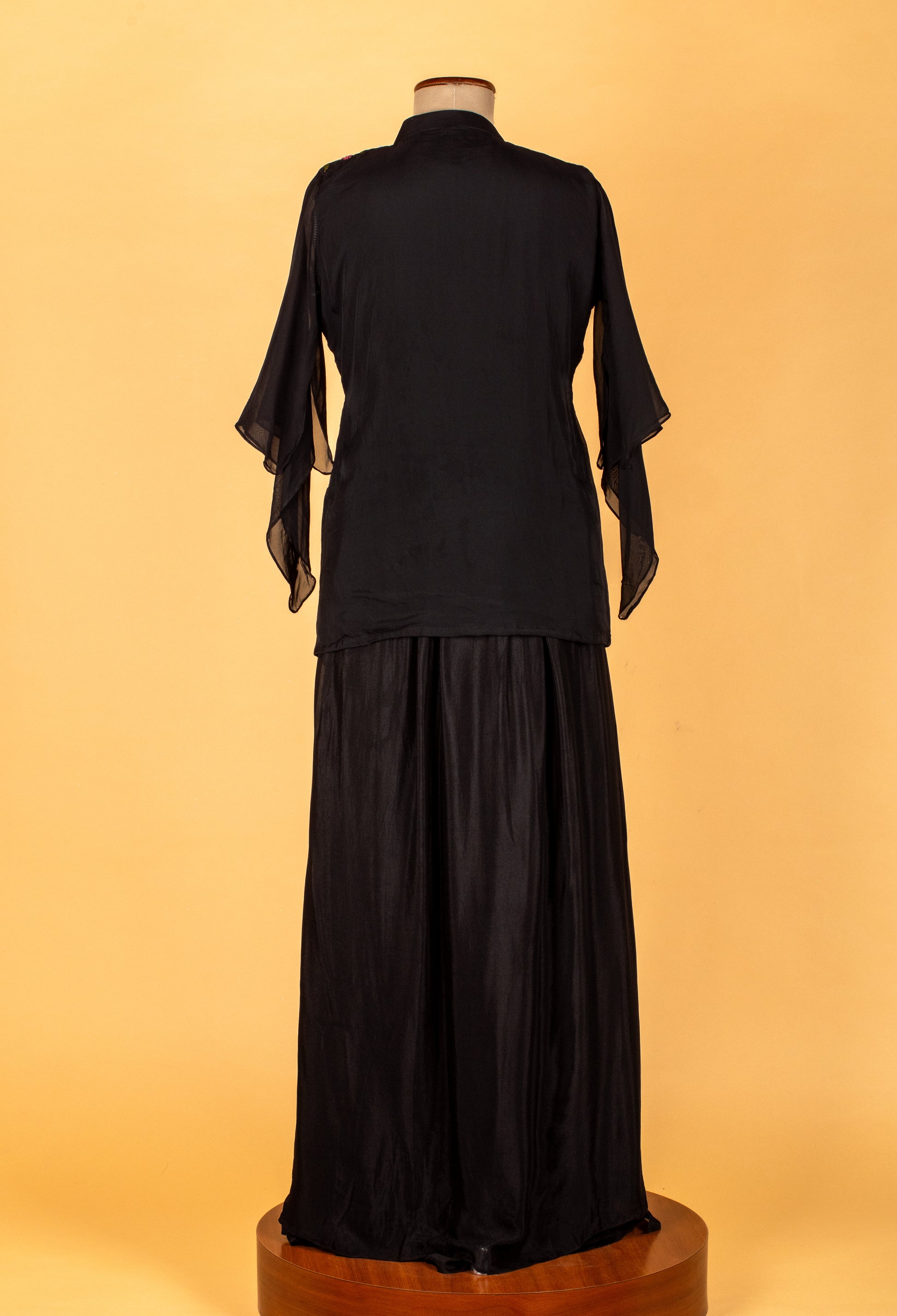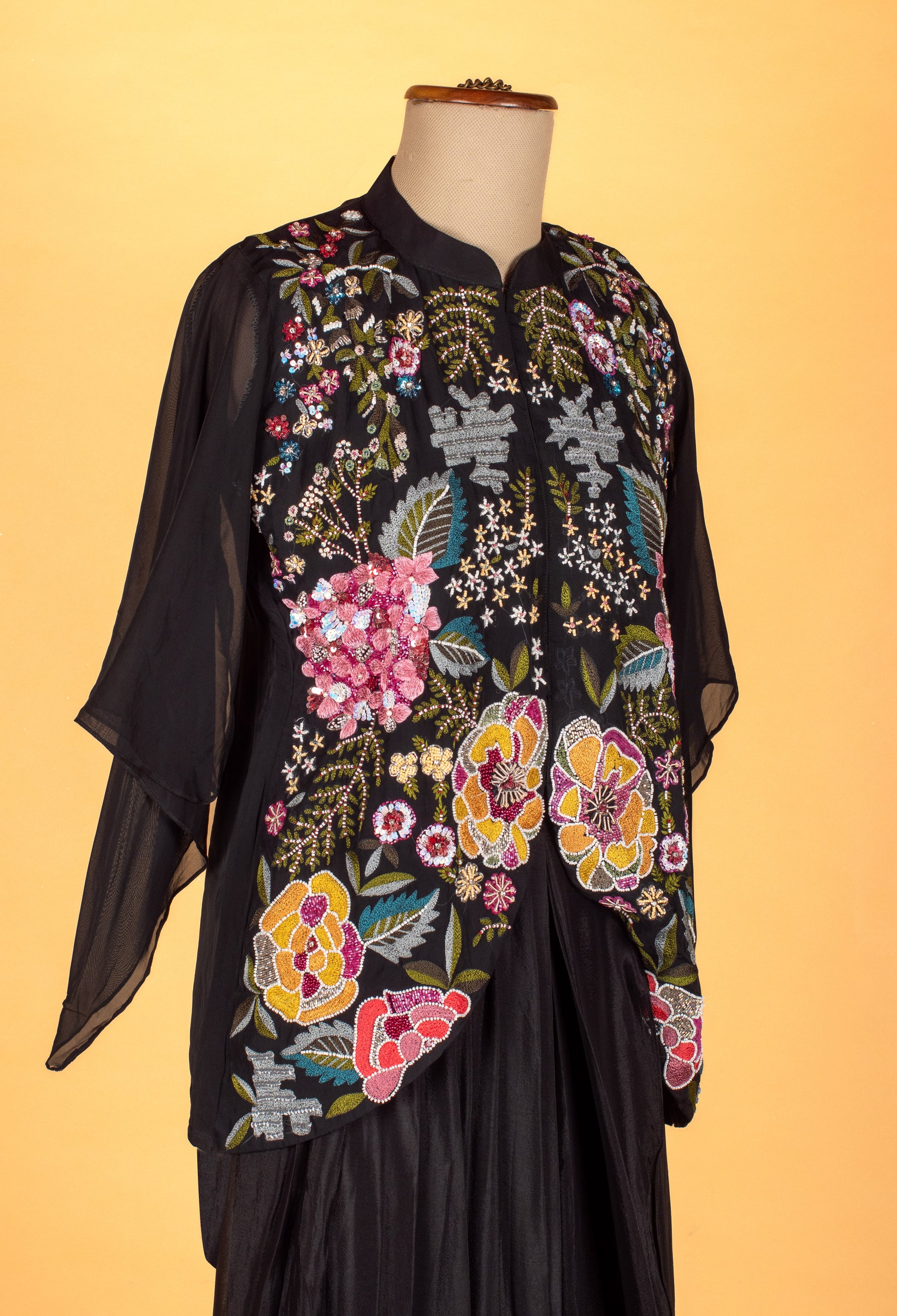 The highlight of the outfit is the organza embroidered cape, embellished with multicolor floral thread work and sequence detailing, giving the ensemble a striking blend of modern sophistication and traditional craftsmanship. The cape's asymmetrical cut adds movement and dimension, while the black base keeps the look refined and versatile.