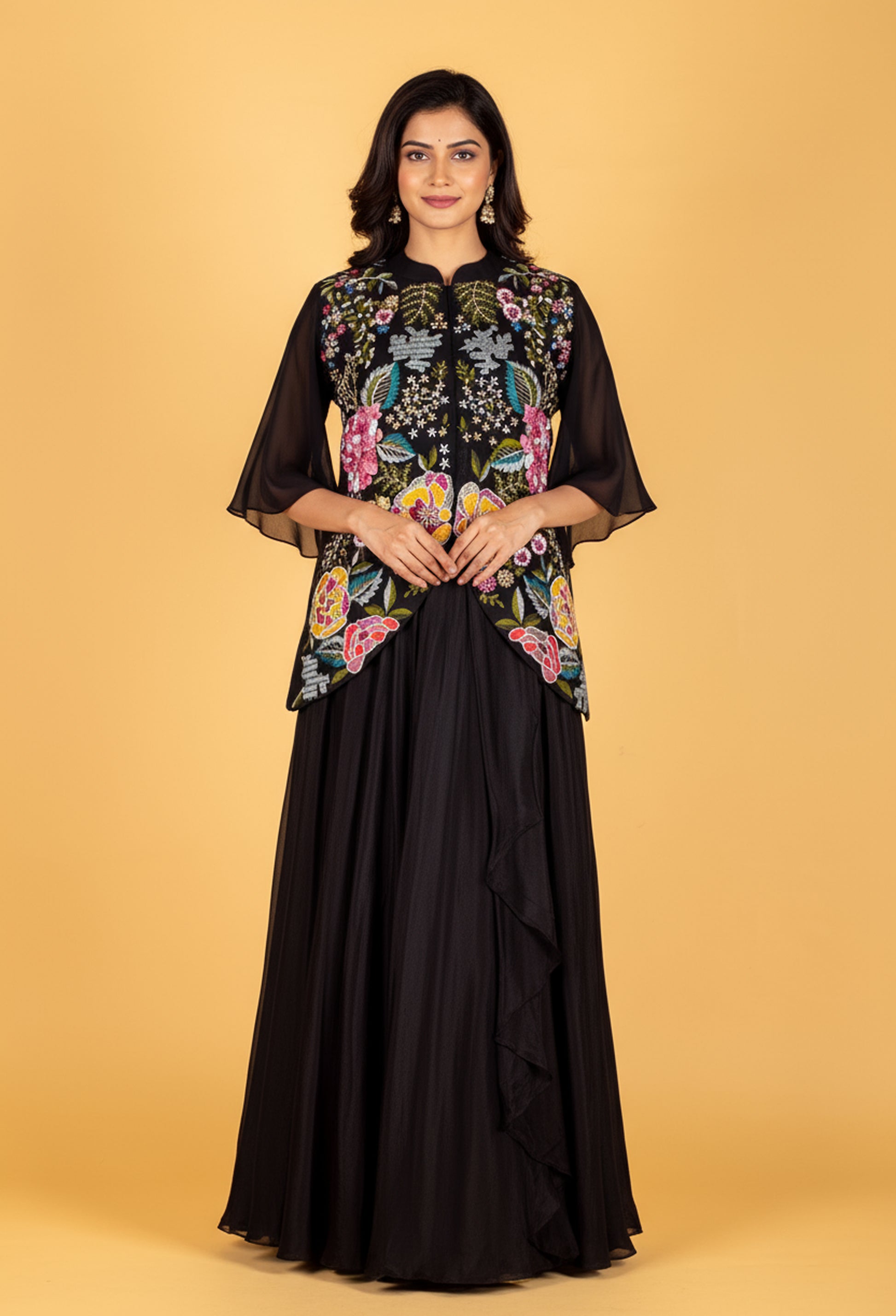 This black Indo Western gown delivers a statement-making look with its elegant straight-cut silhouette and vibrant multicolor embroidered cape. The base gown features a smooth, flowy drape that provides a sleek and elongated appearance without added volume.