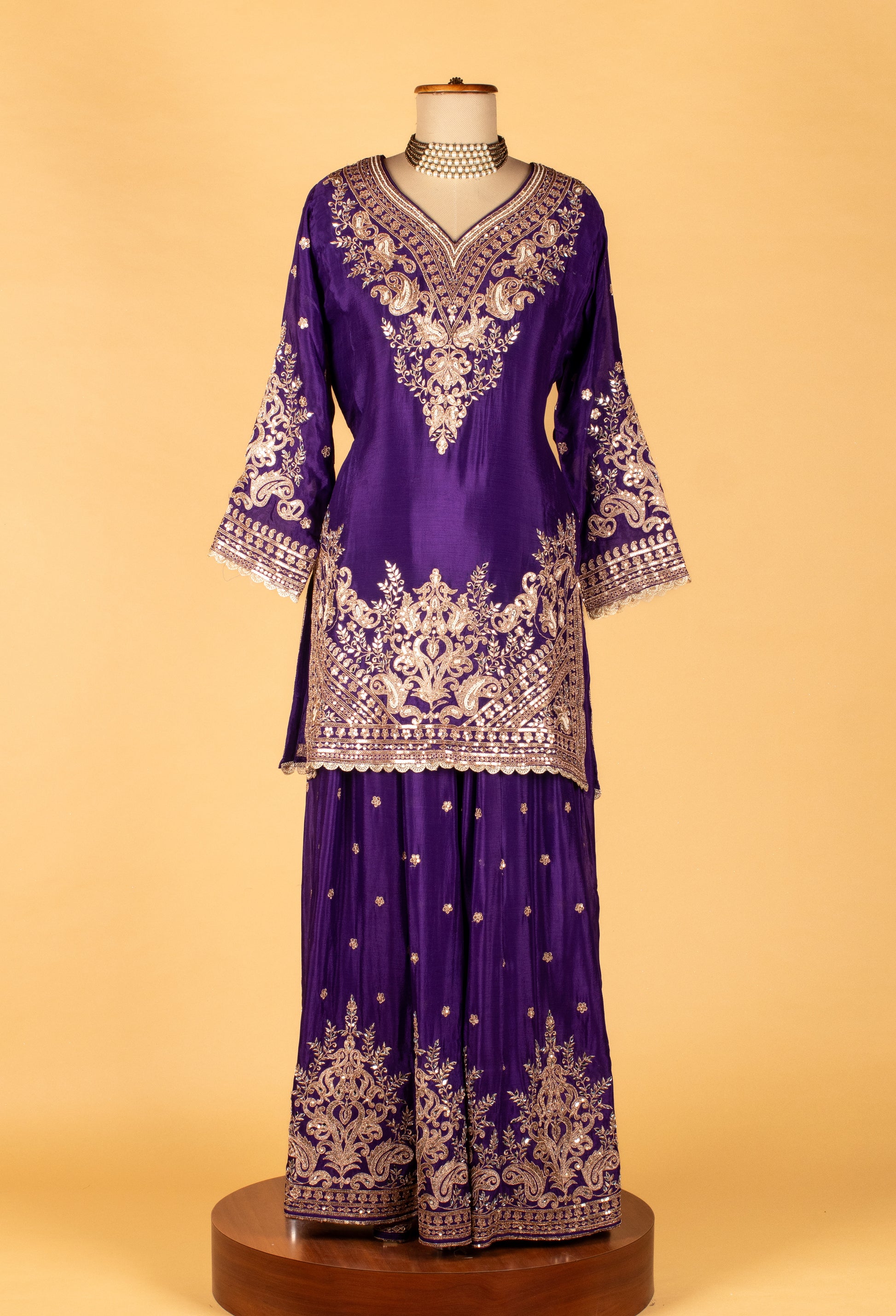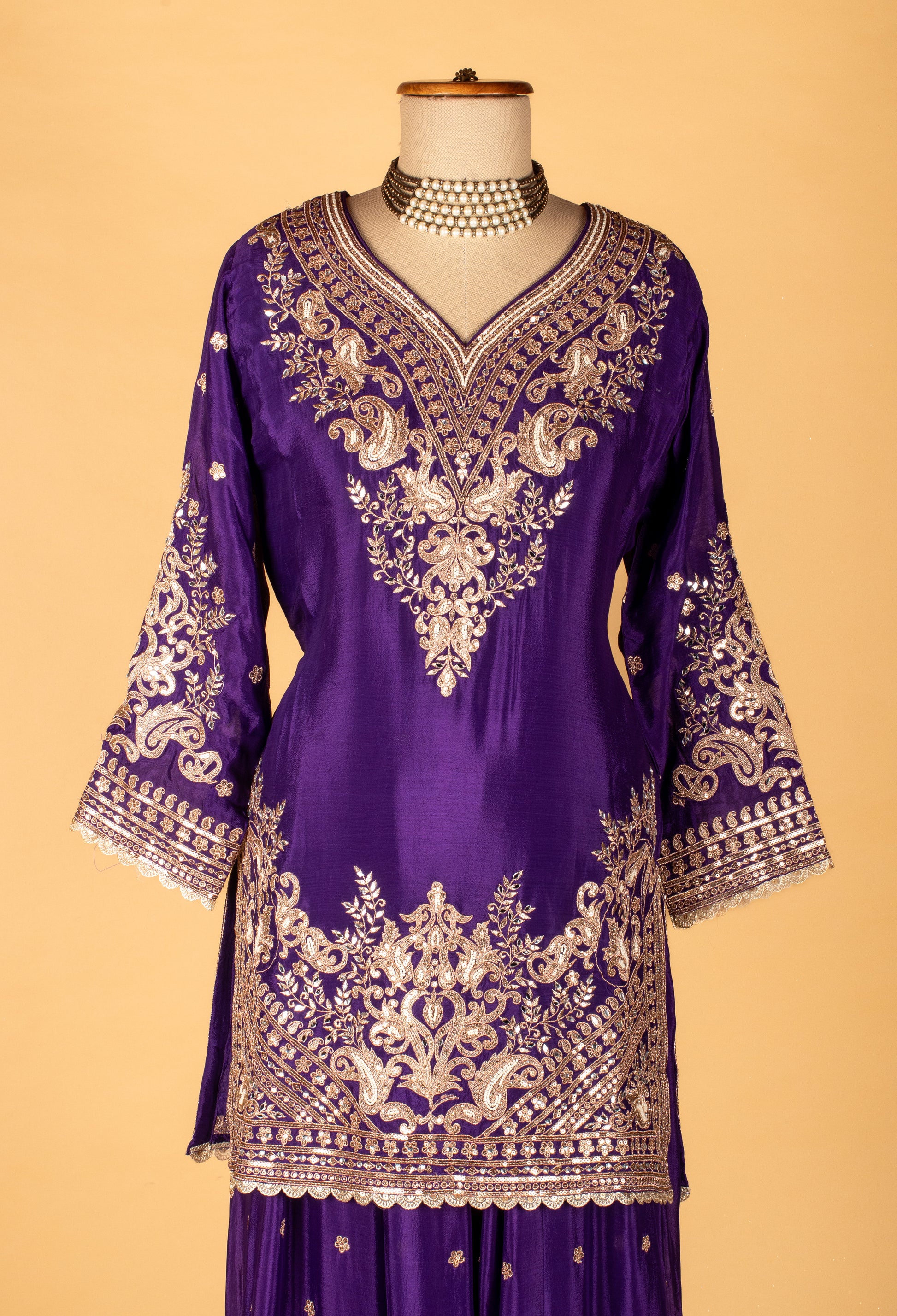 This elegant purple kurta set brings together traditional craftsmanship and modern sophistication. Designed in a straight-cut silhouette, the kurta features intricate golden thread and sequin embroidery that enhances its luxurious look. The embroidery is carefully placed along the neckline, sleeves, and hem, giving the outfit a rich festive finish.