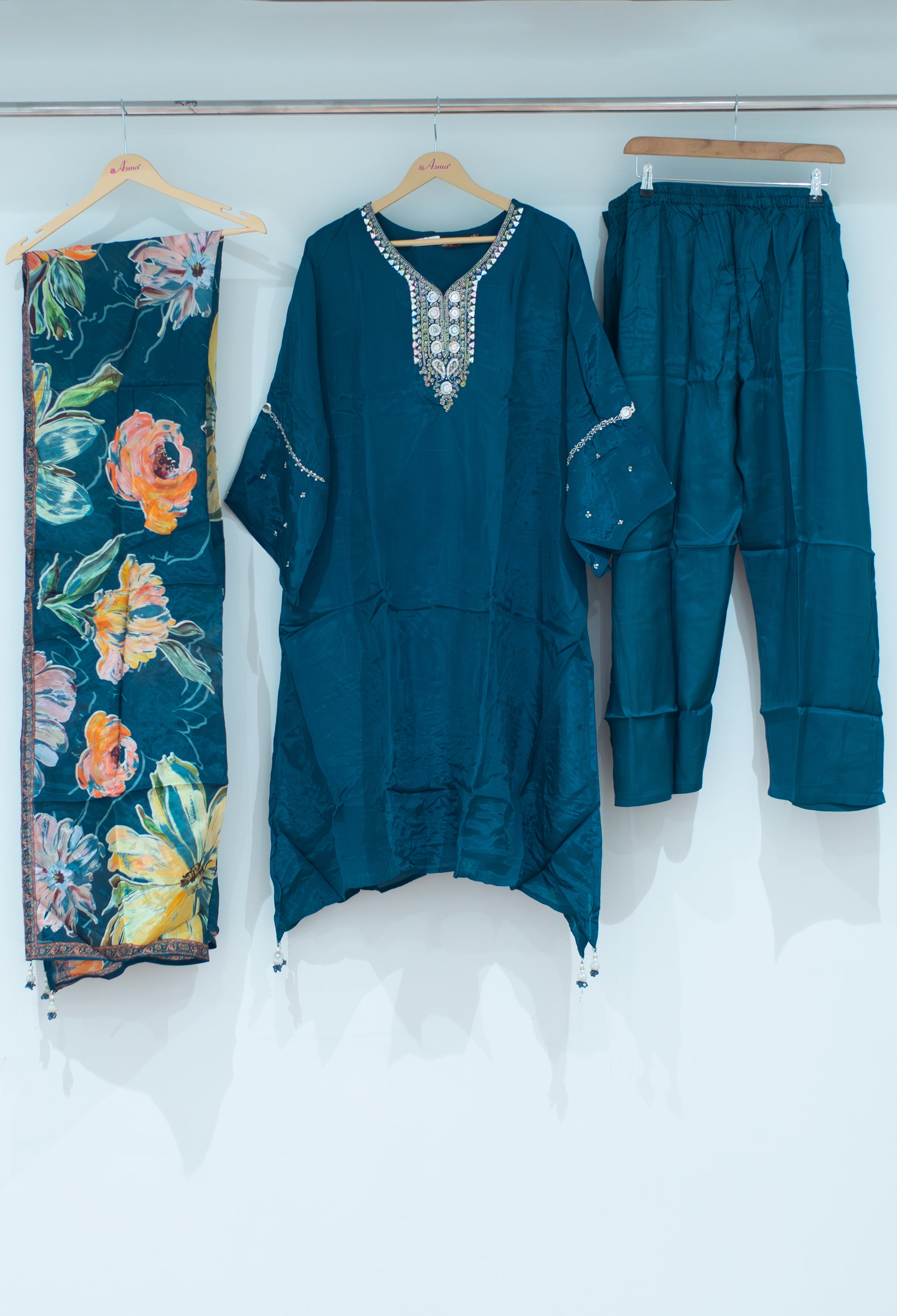 Elevate your ethnic style with this stunning Teal Blue Kurta Set, designed for elegance and comfort. The kurta features a rich solid teal base enhanced with intricate mirror and bead embroidery on the neckline, adding a touch of festive glamour. Its flowy silhouette with tassel detailing at the hem creates a graceful drape.