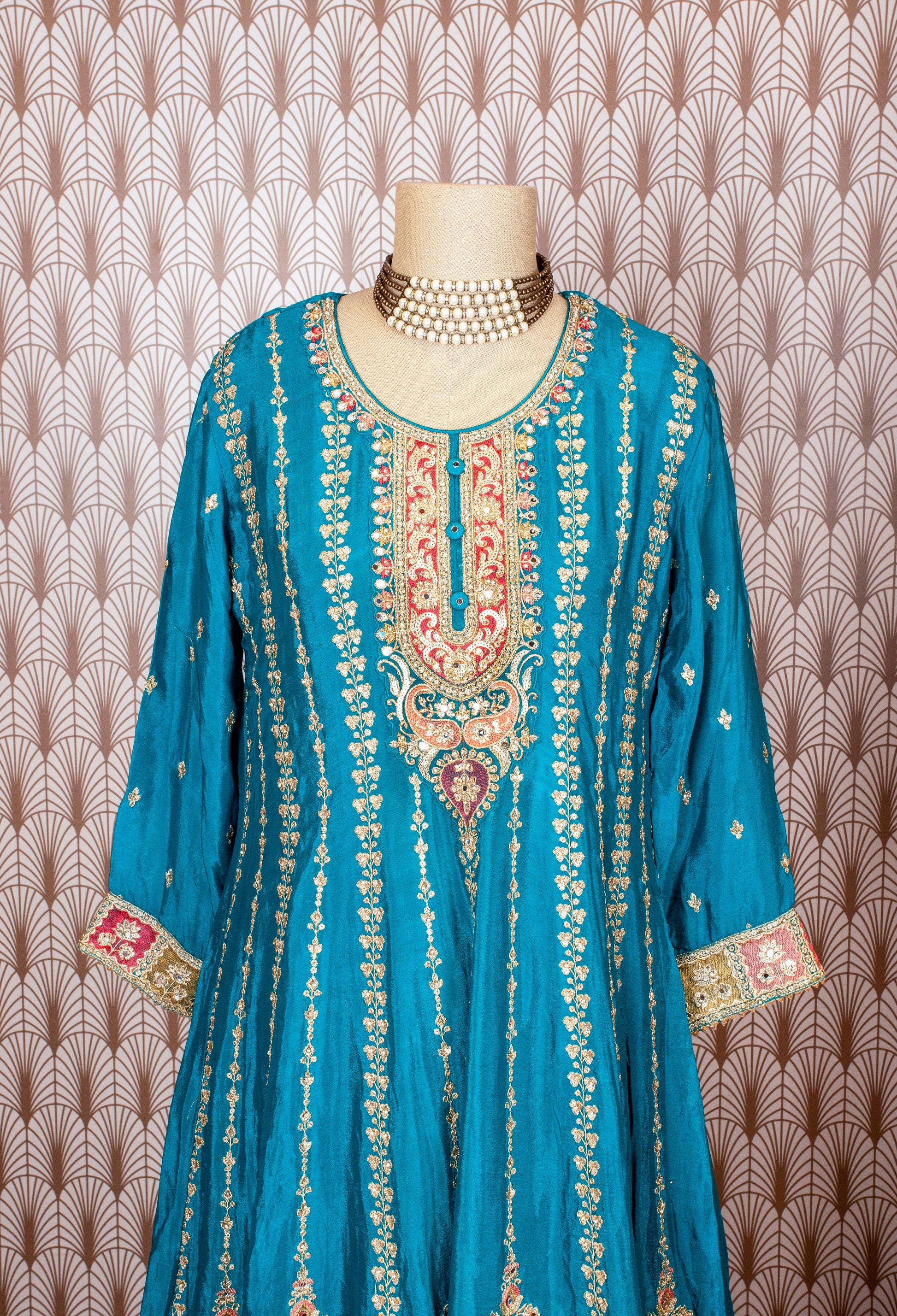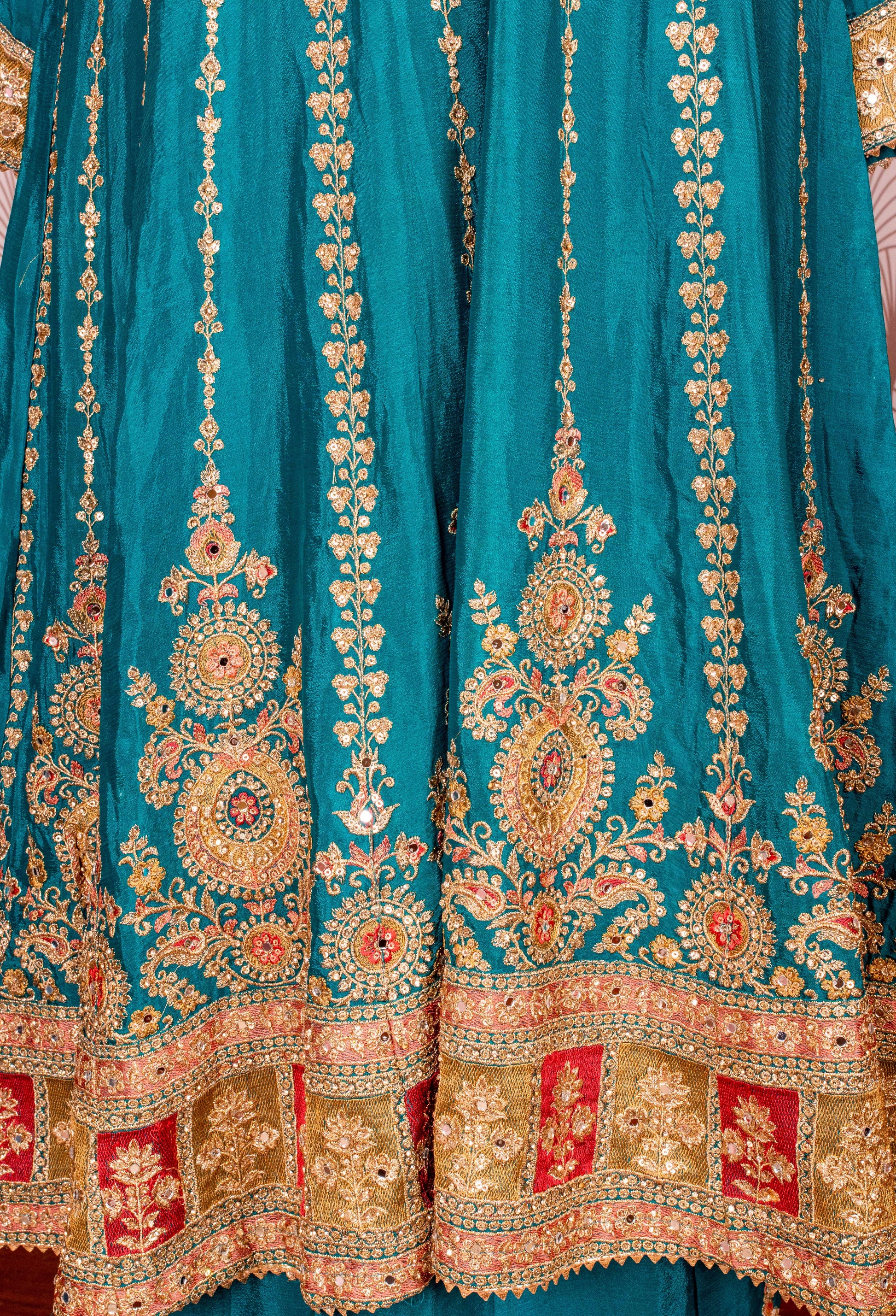 Elevate your ethnic wardrobe with this regal Teal Green Heavy Embroidered Sharara Suit Set, designed to make a statement at every grand celebration. The straight-cut kurta features intricate multicolor zari, resham, and mirror embroidery in traditional Mughal-inspired motifs, beautifully accentuating the neckline, hemline, and cuffs.