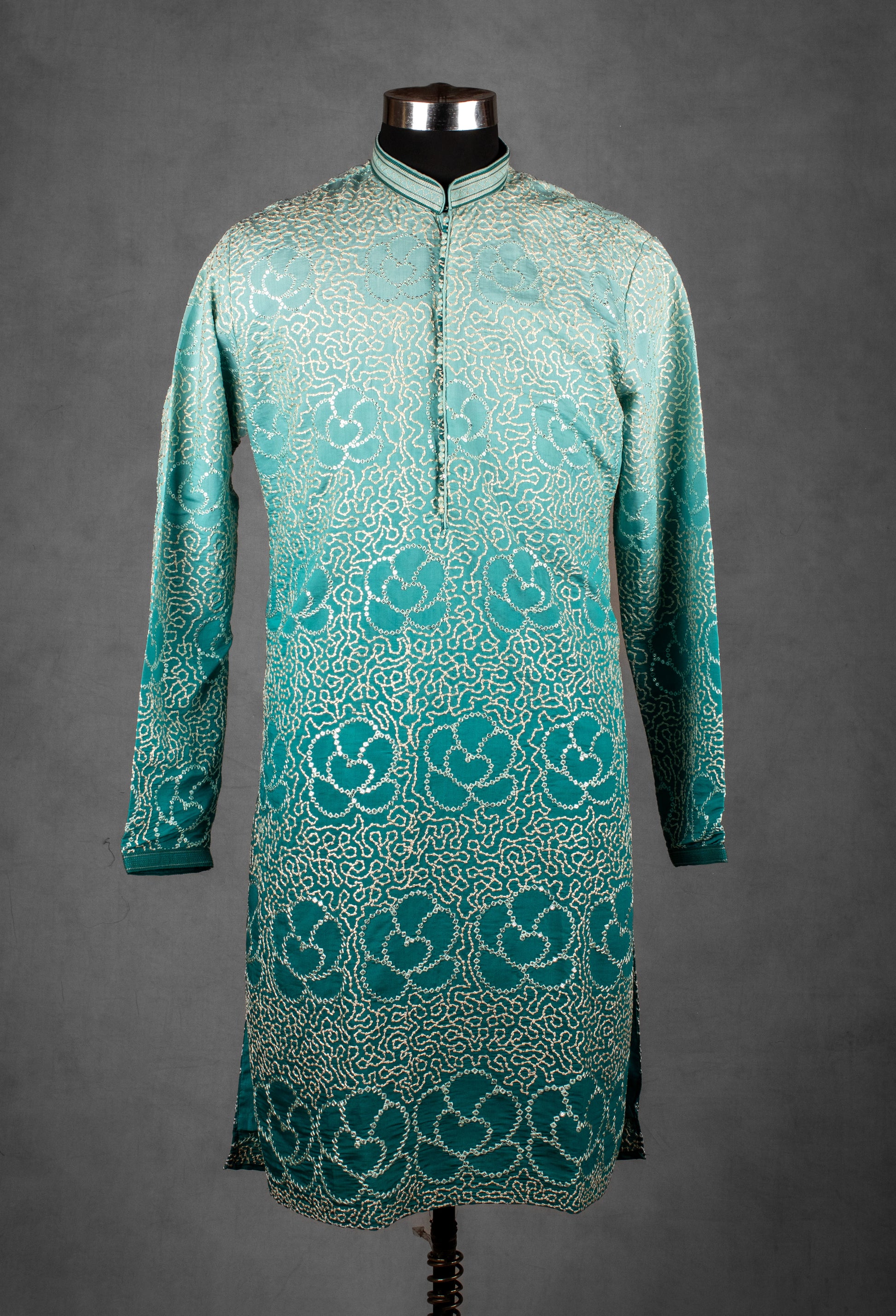 Crafted from soft silk-blend fabric, it offers both style and comfort, making it perfect for weddings, festive functions, mehendi ceremonies, or sangeet nights. The soothing teal green hue beautifully balances vibrancy and sophistication, making this piece a standout addition to your ethnic wardrobe.