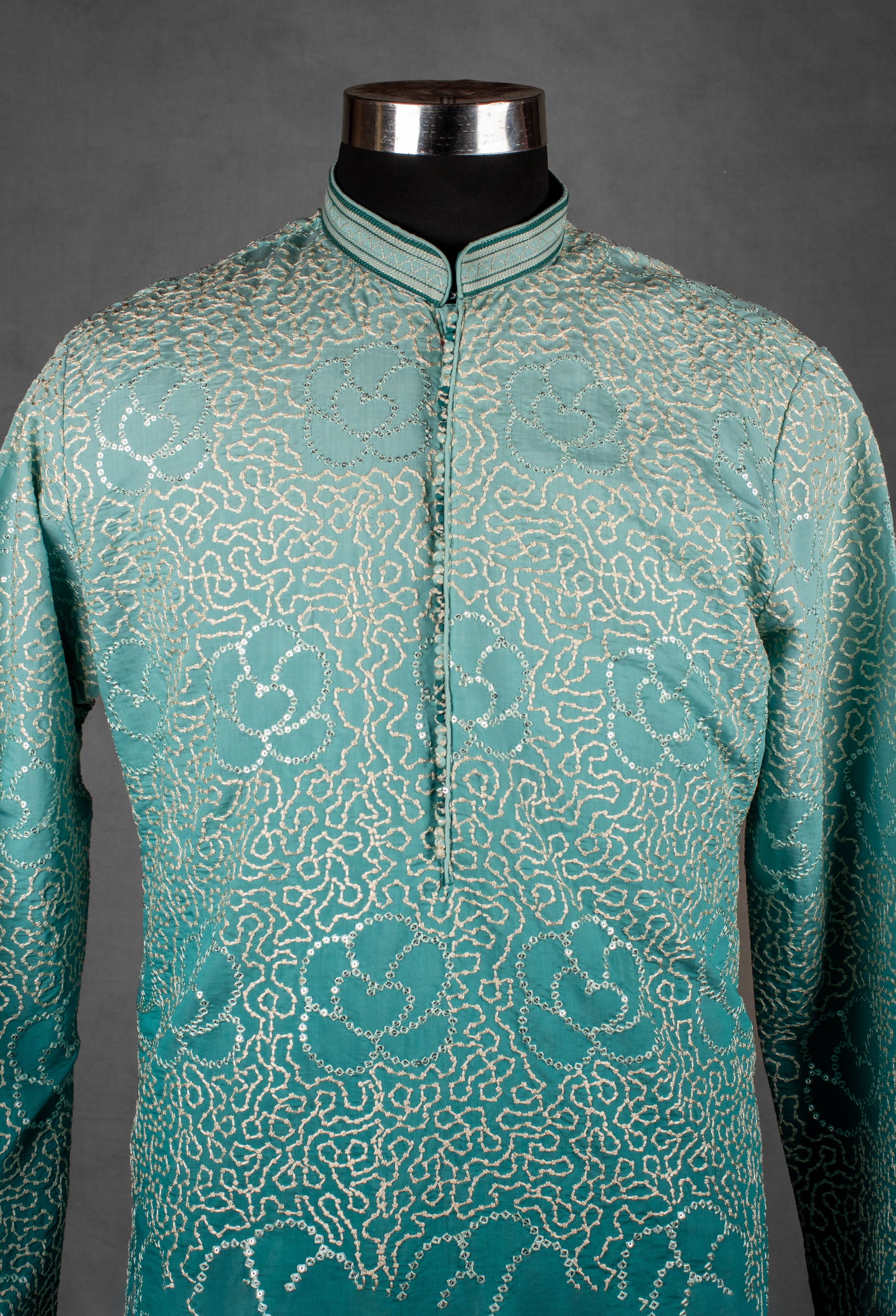 Radiate elegance and festive charm with this Teal Green Sequin Embroidered Kurta for Men, designed for modern celebrations rooted in tradition. The kurta features intricate floral sequin embroidery across the front, sleeves, and hemline, giving it a rich, luxurious appeal.
