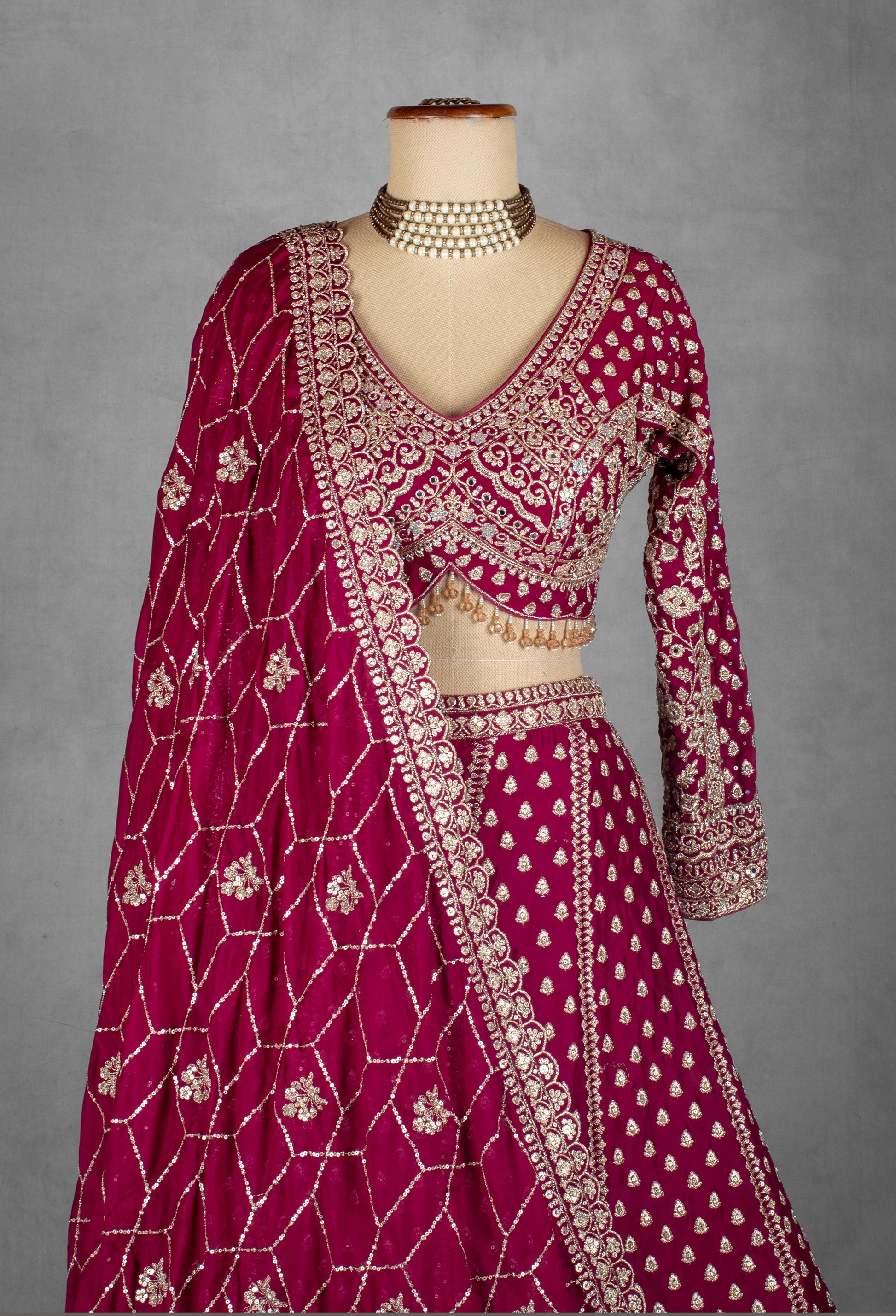 Indulge in royal elegance with this Wine Heavy Embroidered Lehenga Set, crafted with exquisite detailing and rich traditional artistry. The deep wine lehenga features dense zari, thread, and sequin embroidery, arranged in elegant motifs and layered borders that create a luxurious, heritage-inspired silhouette. The combination of scattered butti work and intricate floral patterns enhances its regal charm.