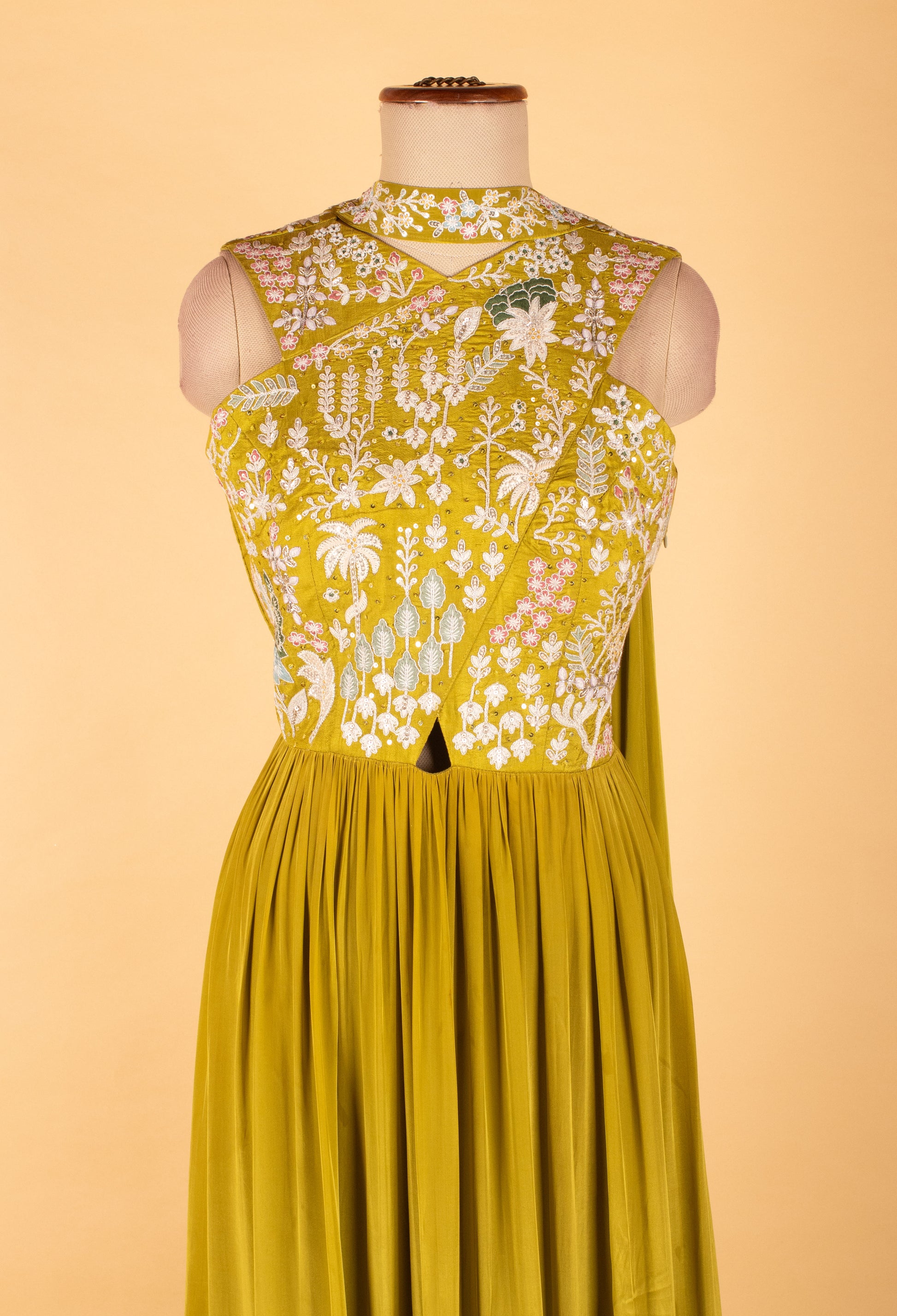 Step into effortless elegance with this stunning mustard yellow embroidered Anarkali gown, designed to make a graceful statement at festive and special occasions. The fitted bodice features intricate floral and nature-inspired embroidery in contrasting threadwork, adding rich artisanal charm and visual depth.