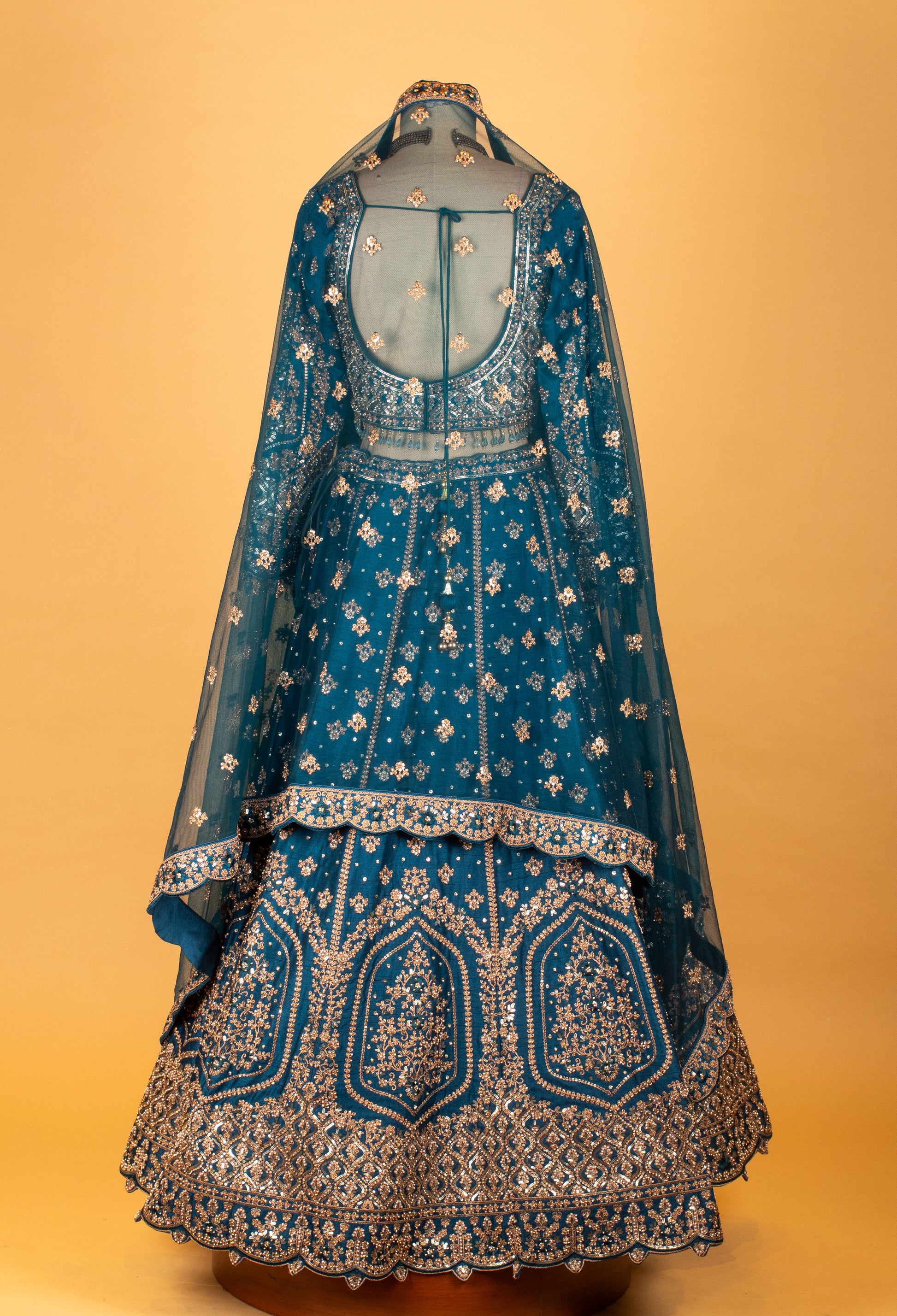 This exquisite teal blue bridal lehenga choli is a true masterpiece of craftsmanship and royal fashion. Designed with intricate zari embroidery, fine sequin embellishments, and luxurious detailing across the skirt panels, this outfit radiates elegance and celebration charm.