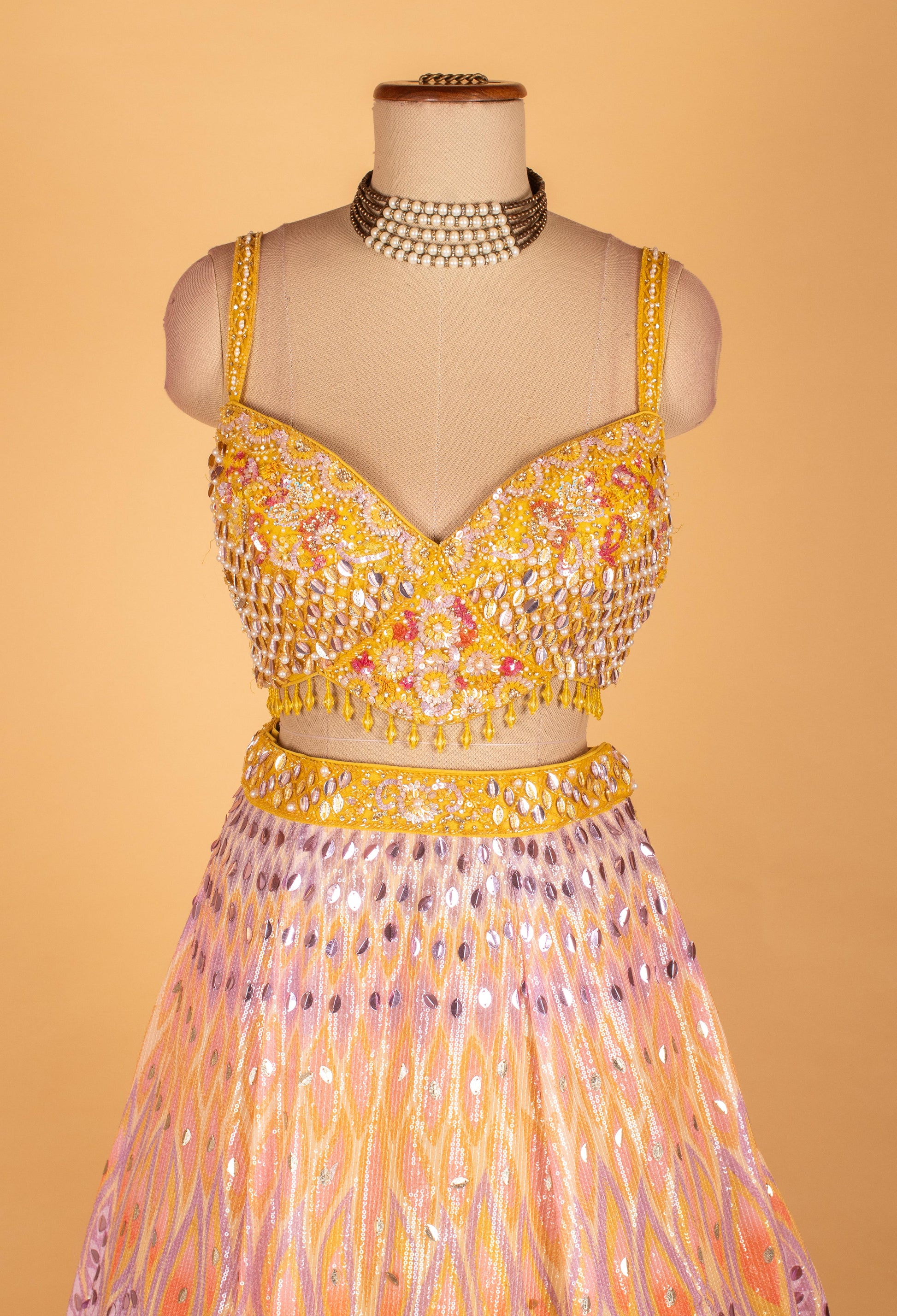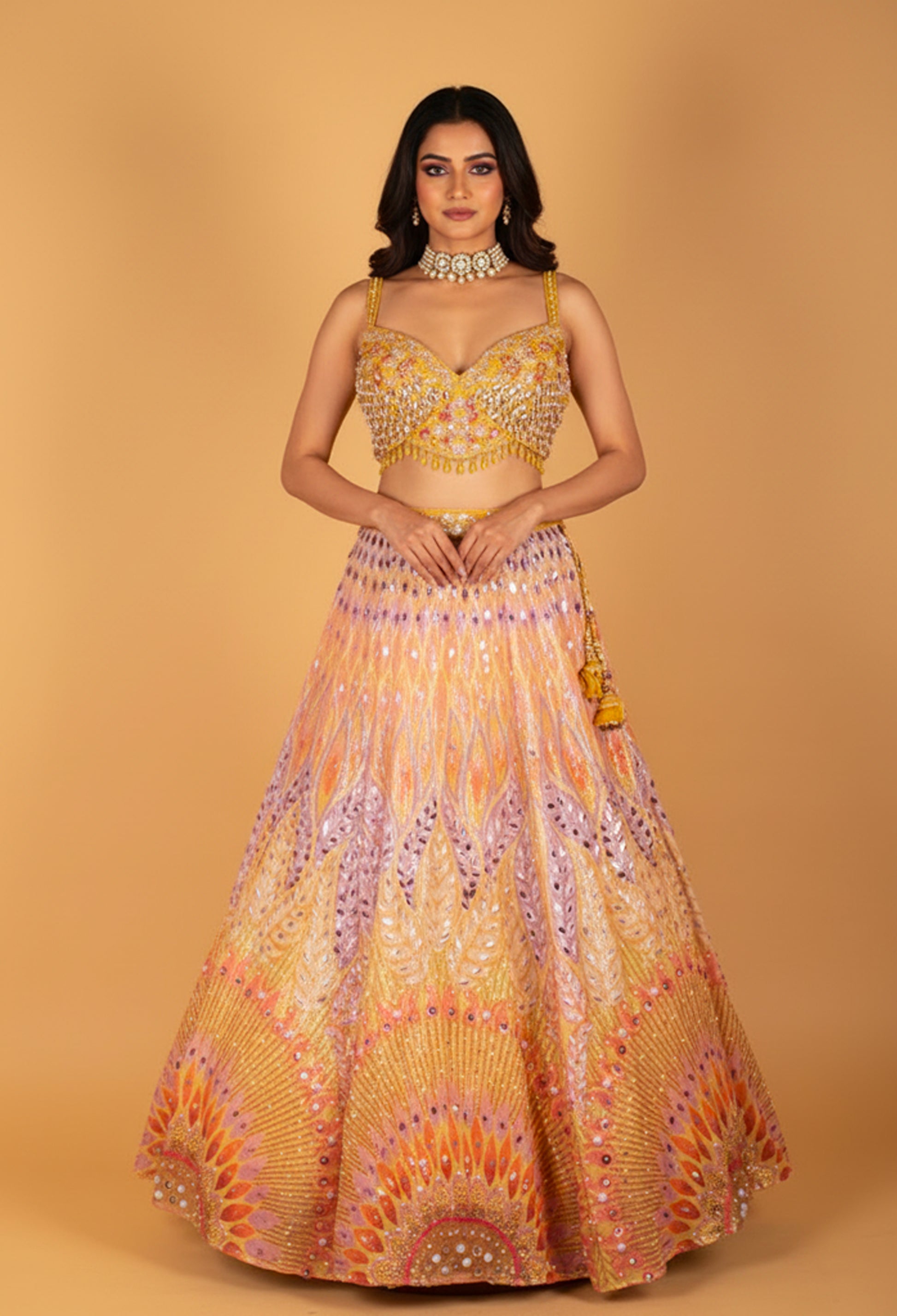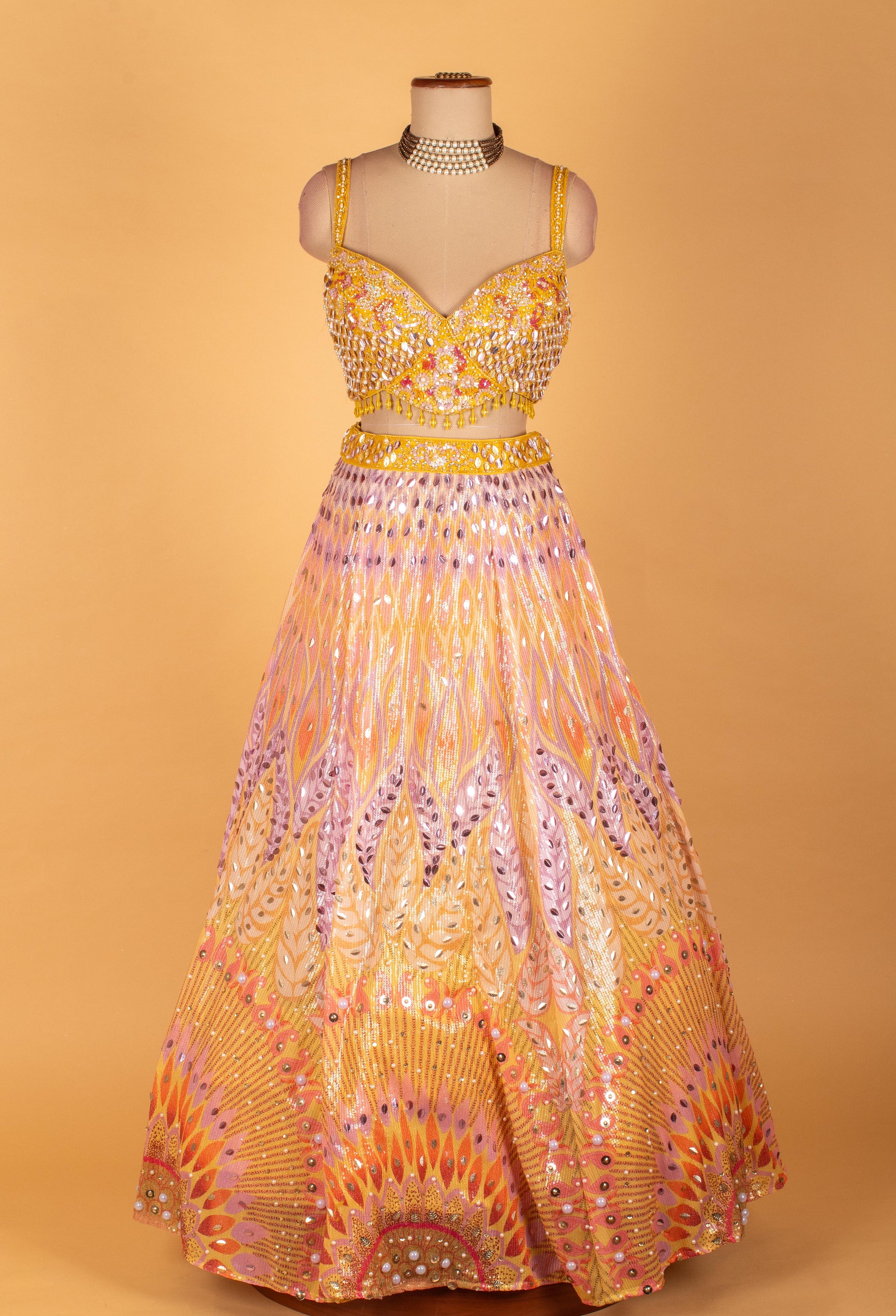 Bring a burst of sparkle and celebration to every occasion with this eye-catching yellow multicolour lehenga set. Designed with a radiant blend of hues, this lehenga features intricate sequin and thread embellishments arranged in a captivating pattern that brings a festive glow to your look.
