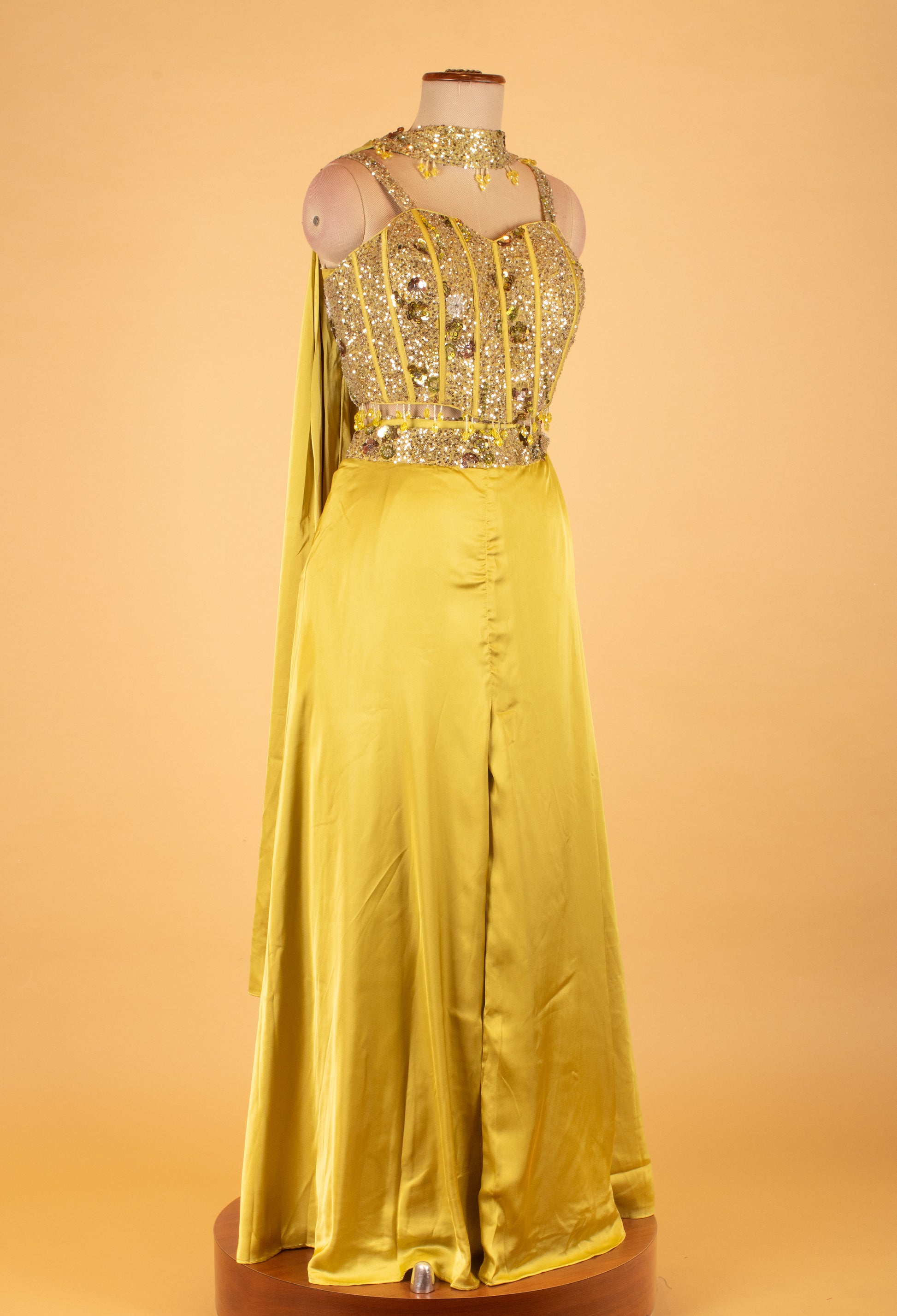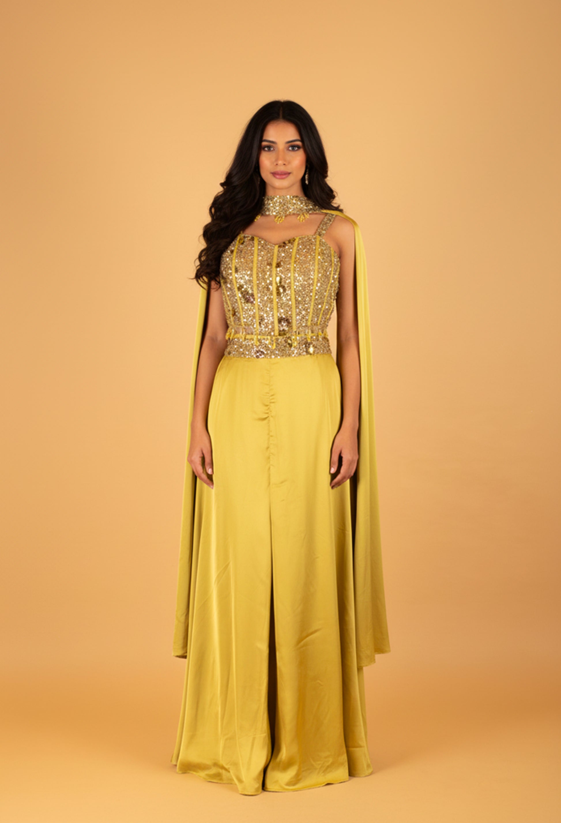 Shine brighter than the spotlight in this luxurious yellow designer jumpsuit. The fitted corset-style bodice is richly adorned with shimmering sequins, beads, and reflective stone embellishments, adding an opulent, dramatic effect.
